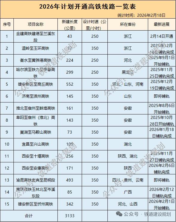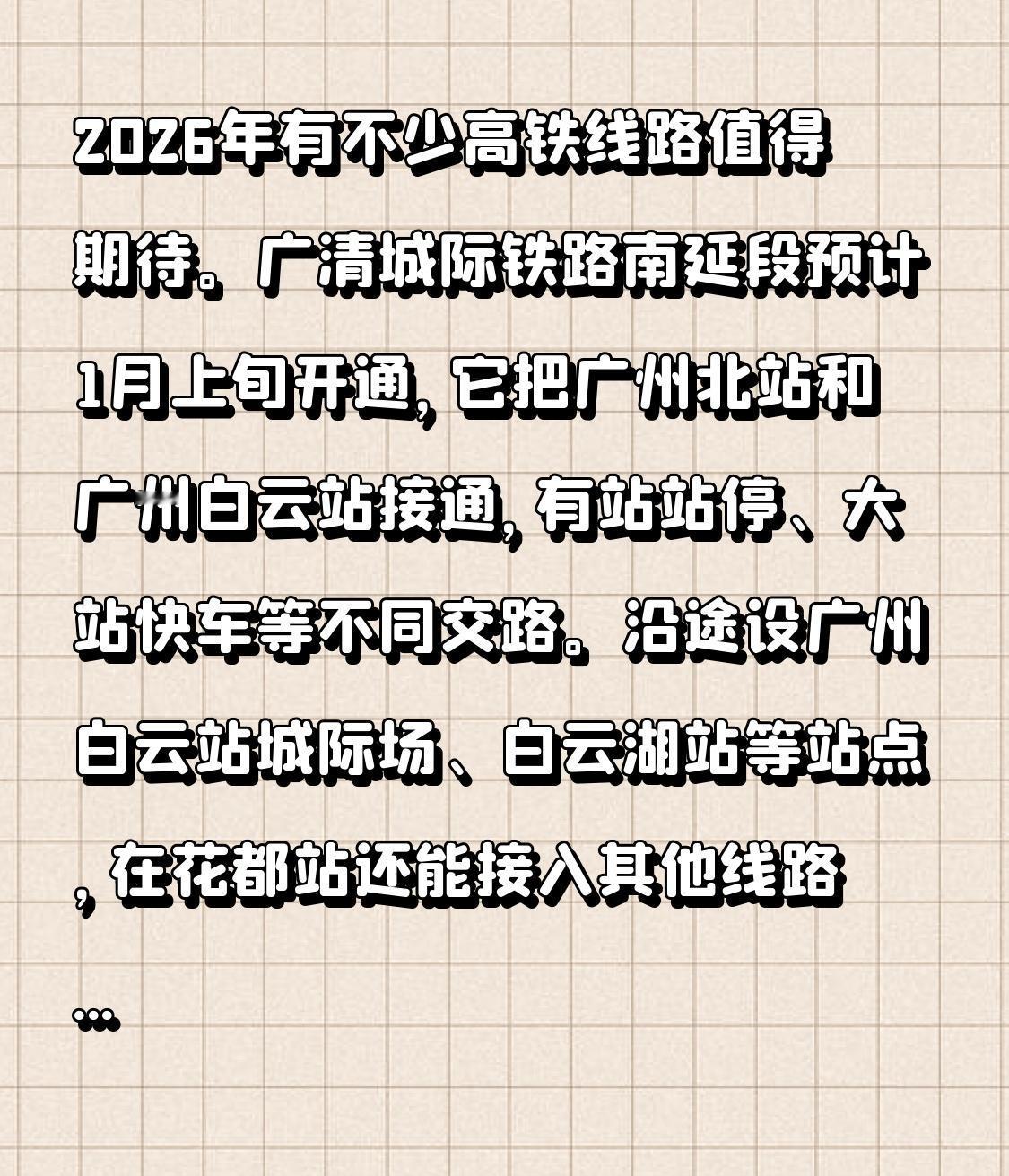 2026年计划开通高铁线路一览表→ 🚄2026年有不少高铁线路值得期待。 🚆广清城际铁路南延段预计1月上旬开通,它把广州北站和广州白云站接通,有站站停、大站快车等不同交路。沿途设广州白云站城际场、白云湖站等站点,在花都站还能接入其他线路,能去清城、白云机场等方向。 🚄兰溪至建德高铁2025年底试运行,2026年1月26号开通并调图,设计时速250公里,连接多条重要线路。 宜兴高铁2025年12月26日宜昌东站至杨家坝段运营,2026年上半年开通下堡坪段至兴山段,设计时速350公里,连接武宜和郑渝高铁。 🚝杭温高铁沪昆高铁联络线2026年投入运营,让温州方向能直达杭州东站和南站。 高铁规划 中国高铁规划图 高铁线路 高铁