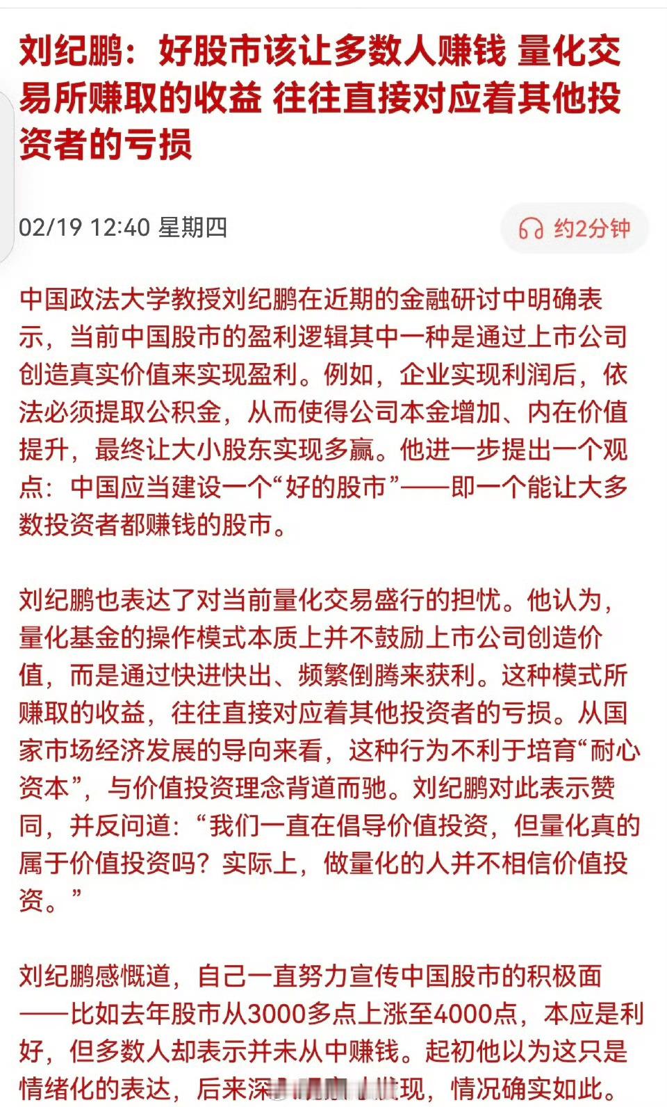 刘纪鹏:好股市该让多数人赚钱,量化交易所赚取的收益,往往直接对应着其他投资者的亏损