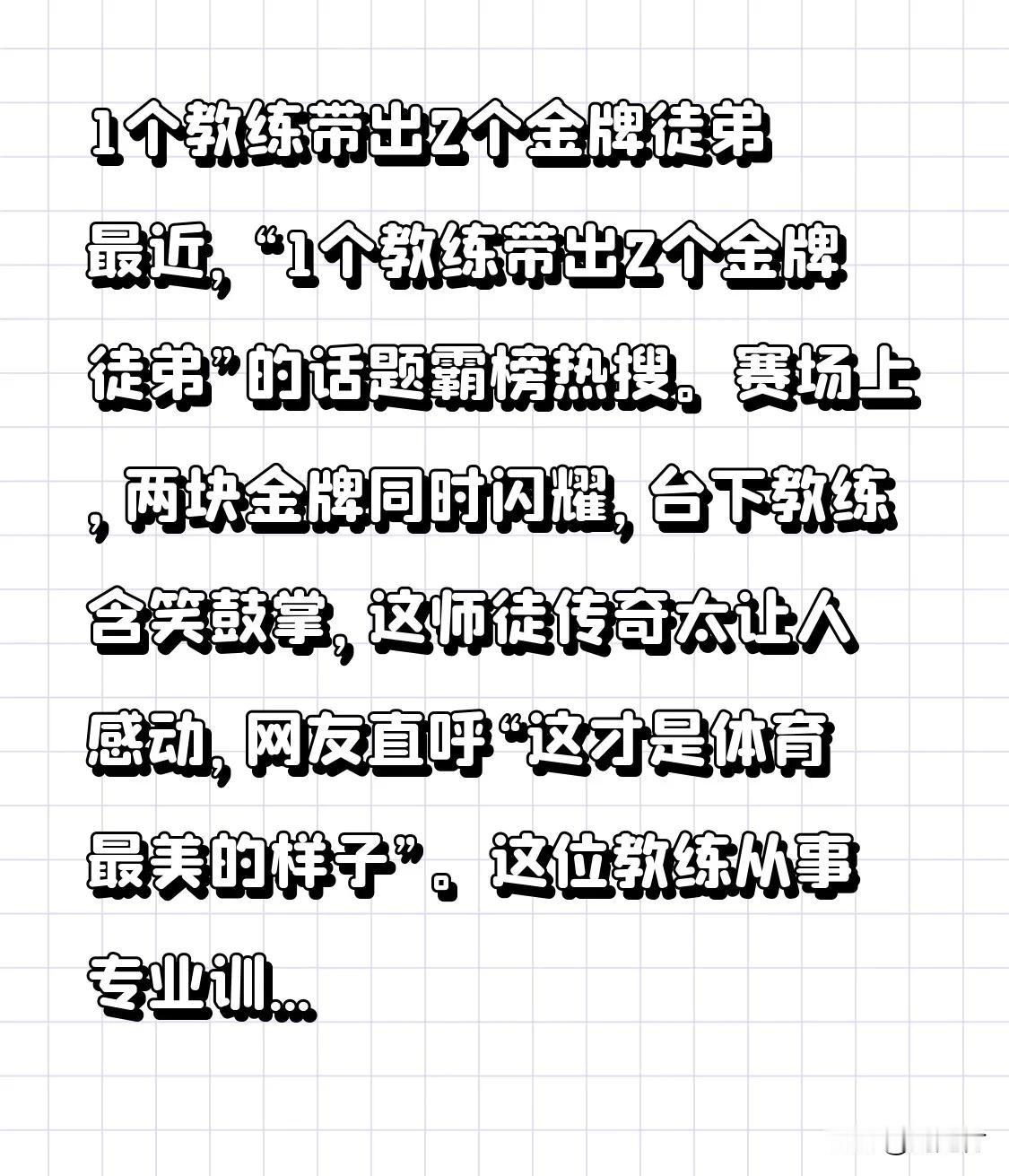 1个教练带出2个金牌徒弟 一位教练带出两位金牌徒弟 近日,“一位教练带出两位金牌徒弟”的话题登上热搜榜首。赛场上,两块金牌熠熠生辉,台下教练微笑鼓掌。这师徒间的传奇故事令人动容,网友纷纷感叹“这才是体育最美的模样”。 这位教练投身专业训练多年,始终坚持“因材施教”的理念。首位徒弟天赋出众,却陷入瓶颈,教练为其调整训练计划,给予心理支持,助其成功突破;第二位徒弟基础薄弱,教练耐心指导,培养其策略制定与应变能力,使其脱颖而出。 众人往往只看到荣耀的瞬间,却忽略了教练长年扎根训练场,从技术指导到心理疏导全程精心把控。这并非偶然,而是专业、坚守与热爱的结晶,何其珍贵! 大师徒弟 教练排名 运动员教练对比