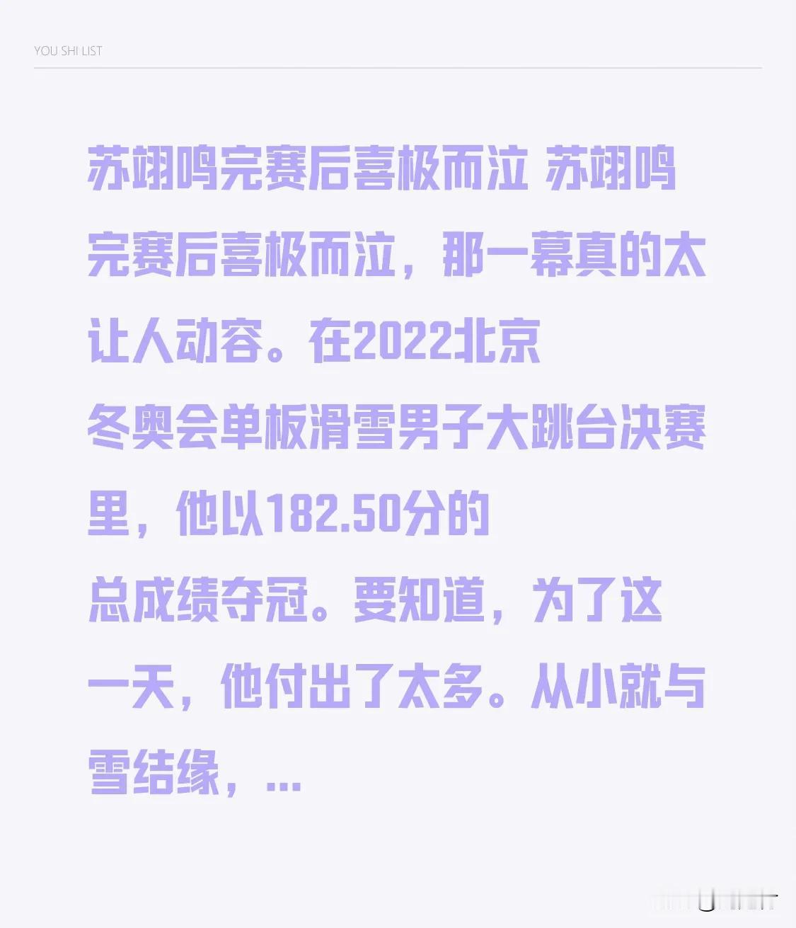 苏翊鸣完赛后喜极而泣 苏翊鸣完赛后喜极而泣,那一幕着实令人动容。2022北京冬奥会单板滑雪男子大跳台决赛,他以182.50分的总成绩夺冠。为了这一天,他付出太多。他自幼与雪结缘,每日刻苦训练,无数次摔倒又爬起。 赛场上,他的每个动作都无比完美,空中旋转、腾跃,宛如雪上精灵。夺冠后,他再也抑制不住激动,泪水夺眶而出。这泪水,是对多年努力的肯定,也是梦想成真的喜悦。苏翊鸣用实力证明自己,他就是雪上王者! 苏翊鸣 苏翊辉 单板滑雪赛