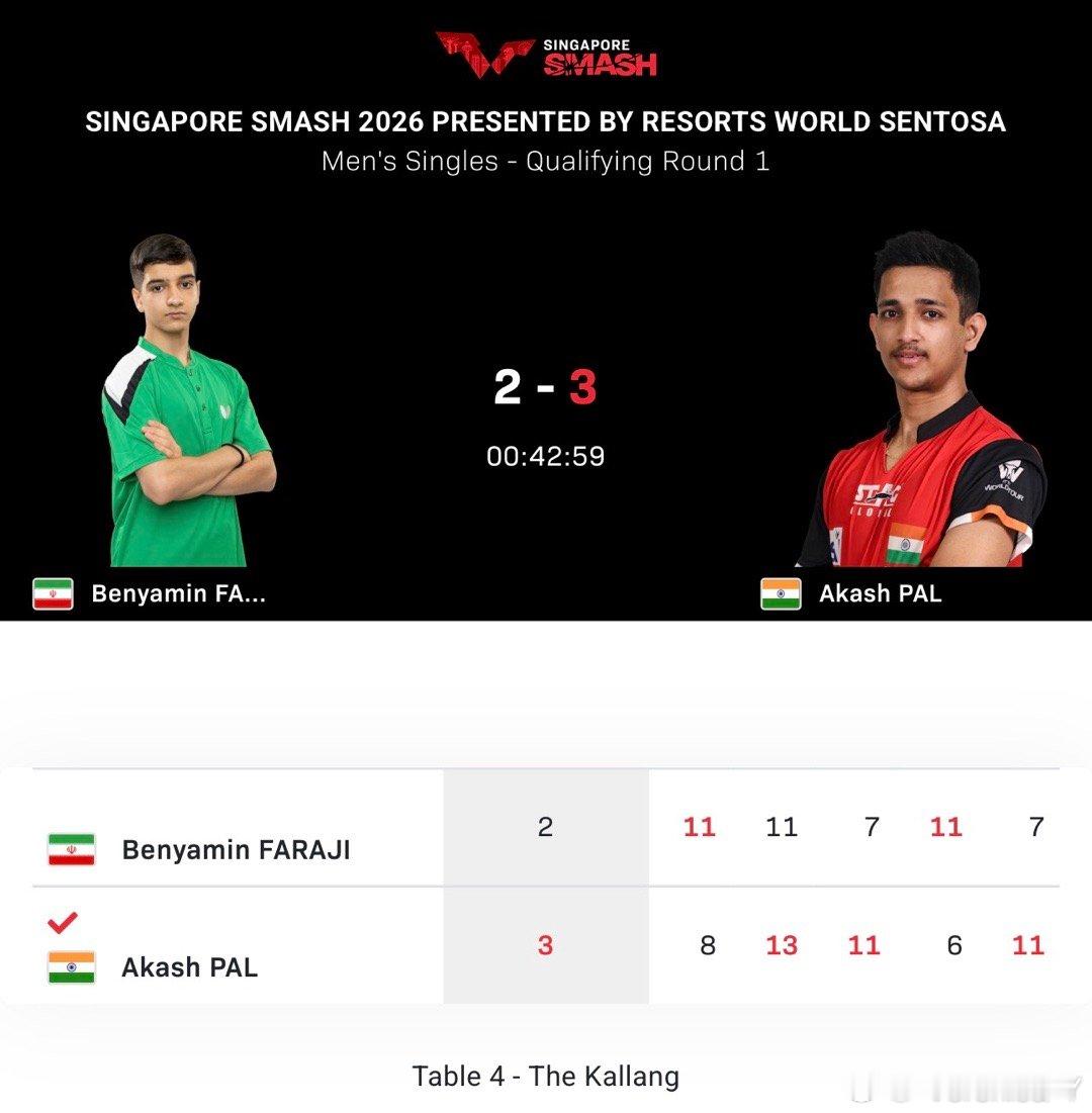 2026新加坡大满贯Q1赵胜敏3-0库曼格里耶夫陈颢桦3-1南丹朴康贤3-0阿波