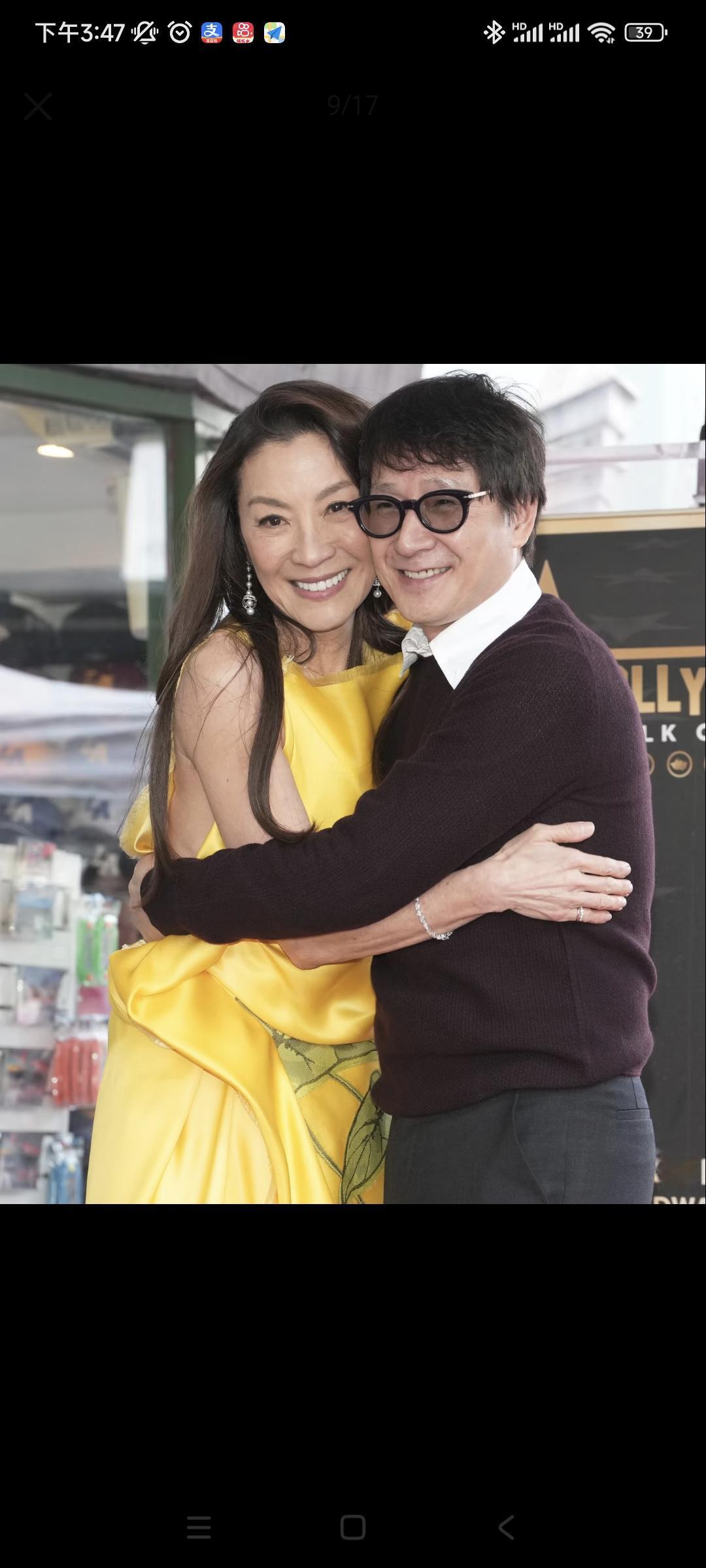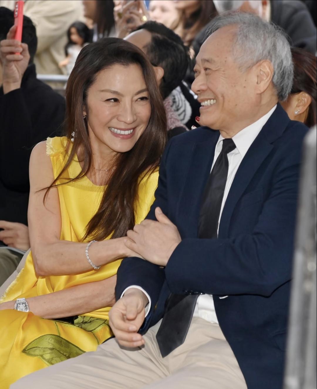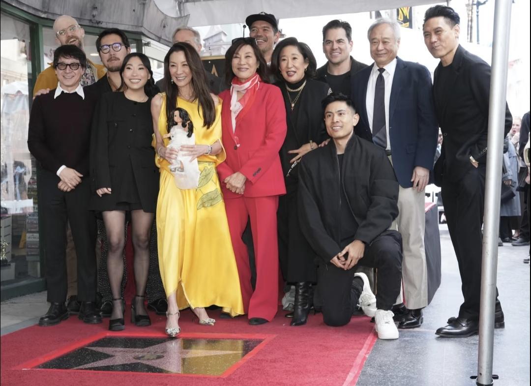 2026年2月18日洛杉矶,演员杨紫琼在好莱坞星光大道留星,成为第九位留名星光大道的华人。在当天举行的留星仪式上,多名圈中好友到场为其庆祝这一历史时刻。 图一 身穿Dior2026早秋系列亮黄色连衣裙的杨紫琼站在专属于自己那颗星的瓷砖之上 图二 笑逐颜开的李安导演,为其捧场 图三 多名好莱坞亚裔演员到场,可以看到杨身旁的奥卡菲娜、珍妮特·杨、吴珊卓(韩裔)、关继威,后排戴帽的应该是王盛德(最近网上很🔥的“给我擦皮鞋”的台词梗,《赌侠2之上海滩赌圣》法国赌王扮演者Declan Michael Wong是他二弟,大弟是香港著名演员王敏德) 图五 李安和朱浩伟两位华裔导演与手持证书的杨合影留念