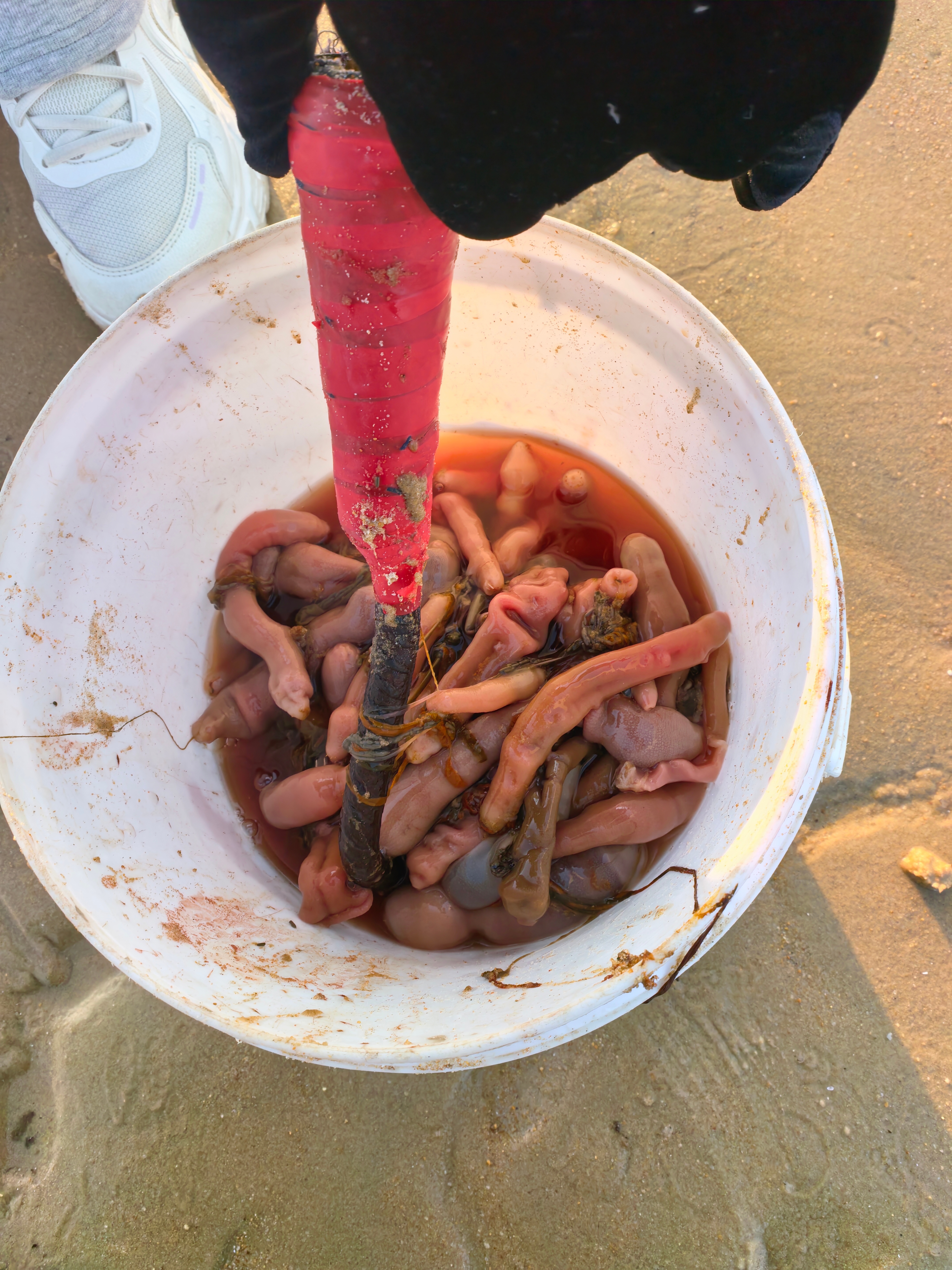 一下午的收获自己赶海虽然累点而且可能半天也挖不上来多少但是看着这满满小半桶的海肠真是发自内心的觉得特别开心虽然是别人挖的