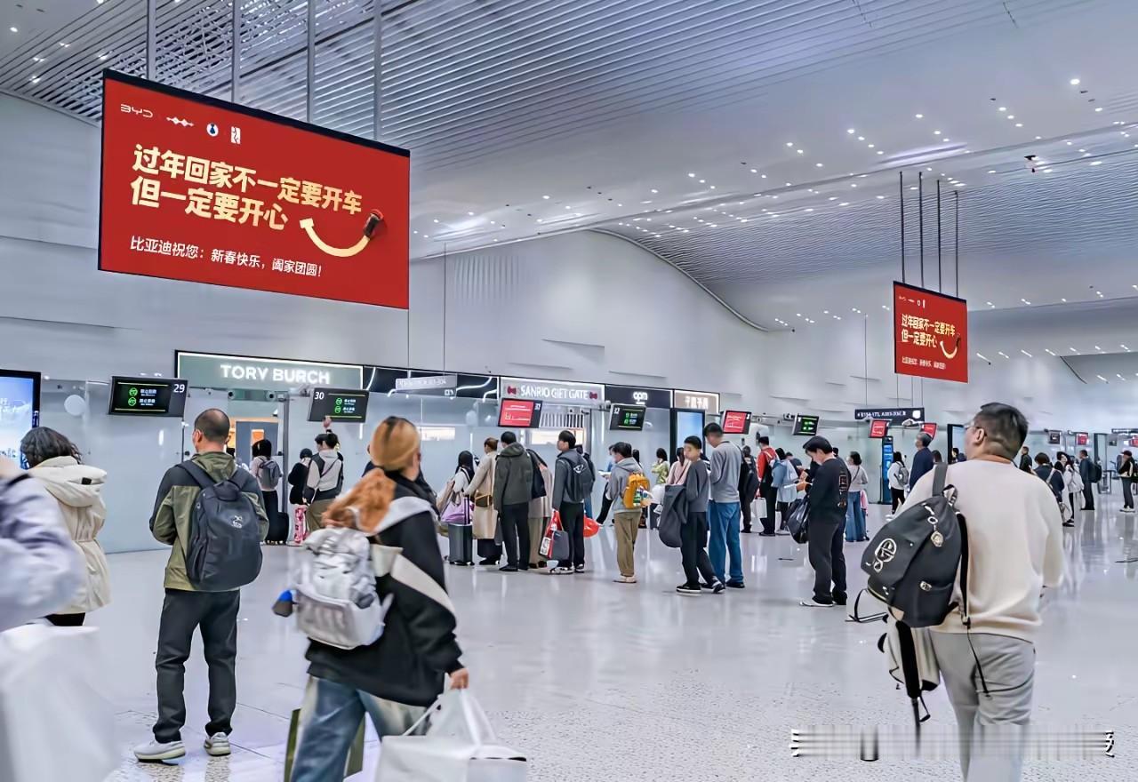 “过年回家不一定要开车,但一定要开心”比亚迪这波新春祝福广告赢麻了! 看下图,第一张是郑州新郑国际机场,第二张是深圳北站,比亚迪的过年广告没有推车型,反倒跳出品牌视角,戳中了归家人的软肋。春运路上,有人自驾奔波,有人辗转换乘,方式从不是重点,团圆与开心才是归途的意义。 比亚迪今年没有赞助央视春晚,而是在各大车站机场投放温情文案,走的是接地气的春运场景营销路线。 不绑架消费,只传递温情,比亚迪这次不谈车型和销量,只谈人心,既拉近距离又彰显格局。这份通透,比任何硬核宣传都更打动人!