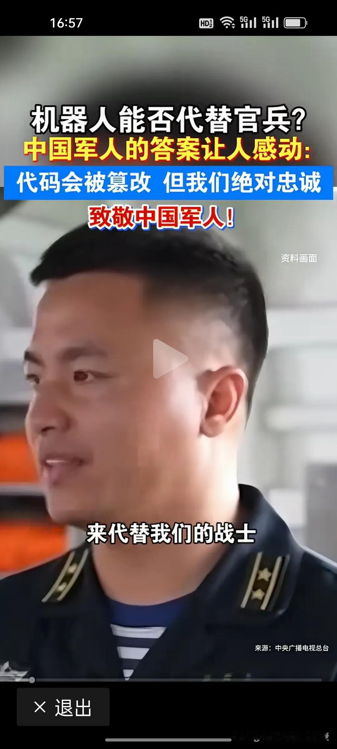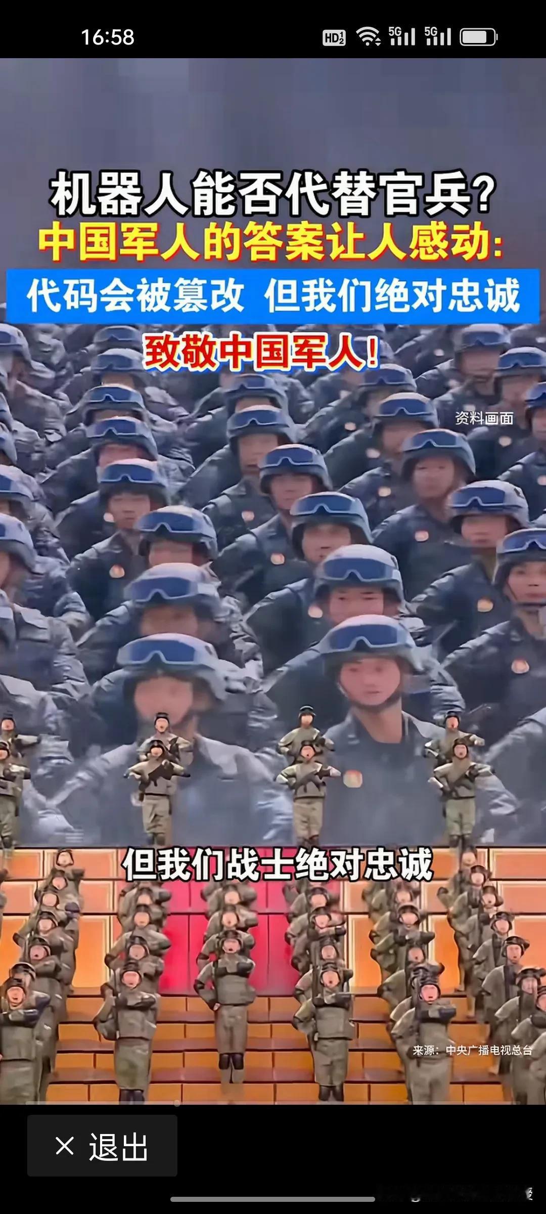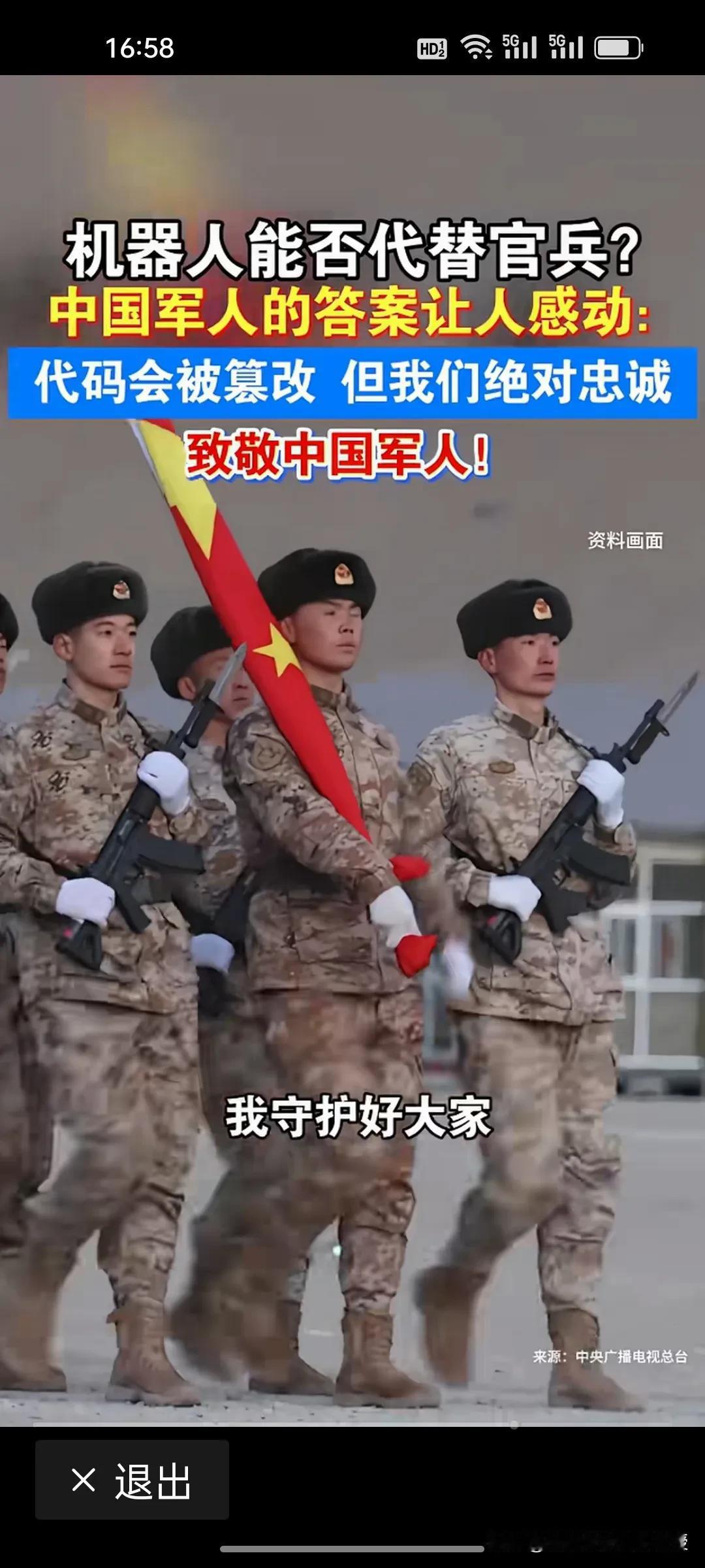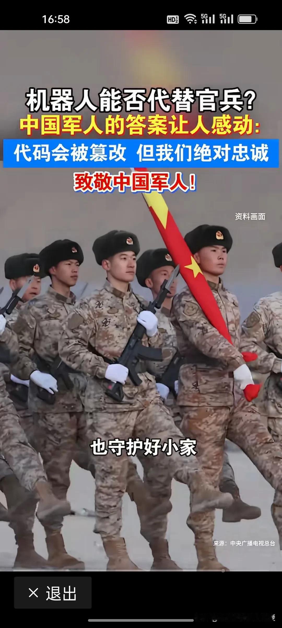 机器人能代替战士吗?中国军人的答案,让人热泪盈眶! 中国军人的回答掷地有声:代码会被篡改,但我们绝对忠诚;机器人没有“家”的概念,而战士们守护的,是身后的万家灯火。 他们有信念、有意志,有“守好大家,也守好小家”的牵挂,有灵活的战术与不可动摇的使命。 战士们怀揣家国情怀,明知艰险仍义无反顾,这份热血与担当,是代码永远模拟不出的。战场上的决断、绝境中的坚守、对人民的赤诚,是机械永远无法拥有的灵魂。 科技再强,也替代不了血肉之躯里的忠诚与热爱。致敬中国军人,这才是我们最坚实的底气!
