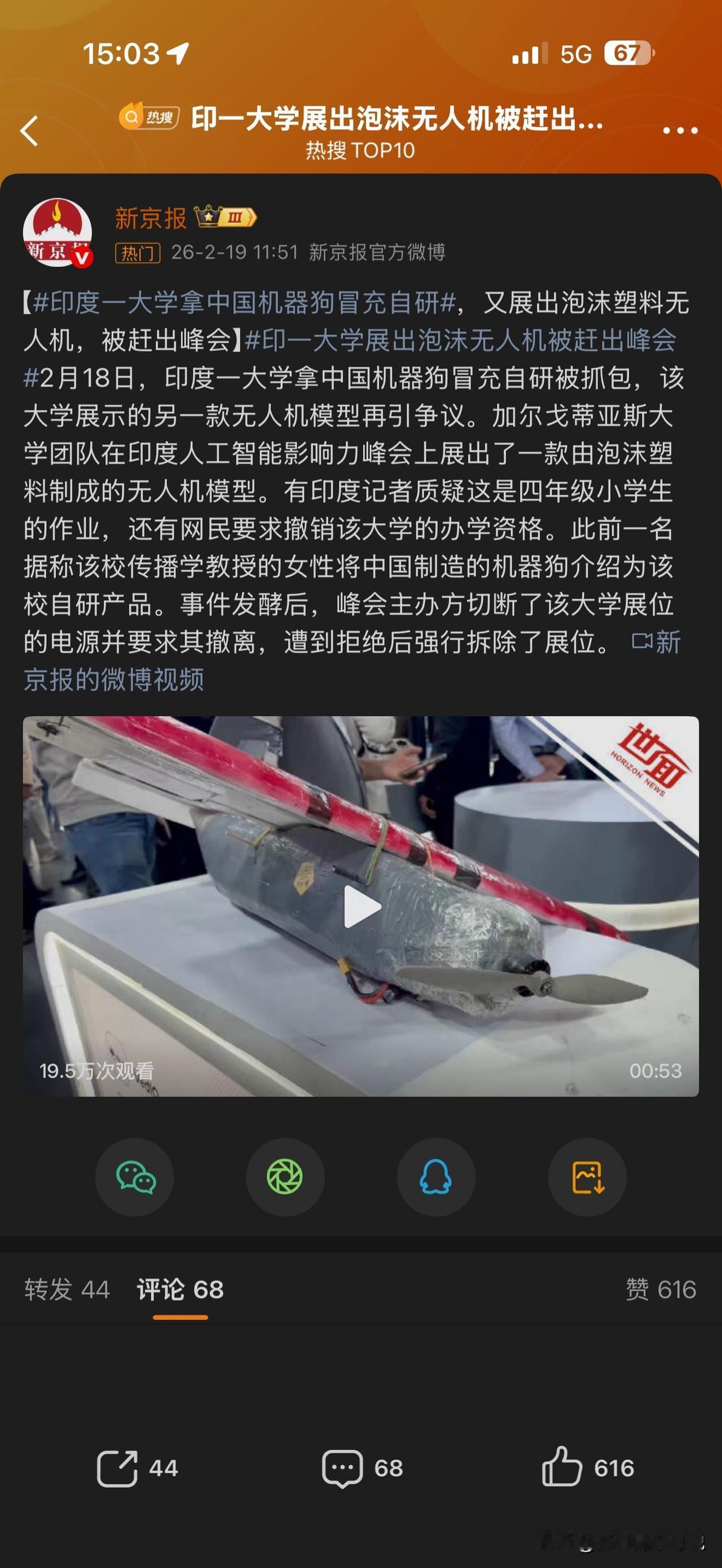 印度Ai峰会真的是洋相百出,参展大学因飞机太粗糙直接被赶出了会场。昨天才有人在网上吐槽印度这次Ai峰会混乱不堪,随后又爆出用中国机器狗冒充自研被当场拆穿的丑闻。今天又被发现更让人捧腹的事情,那就是一所参展大学拿出来的作品无人机居然是用塑料泡沫做的,这都还好,关键这些塑料泡沫是靠不干胶带沾在一起的,需要特别固定处就拿了两根绳子草草绑了一下,连绳头处打的结都非常潦草,你们看倒数第二张图那哥们儿睿智的小眼神,就知道他有多自信和自豪了。别的我就不多说了,细节大家就自己看吧,主打一个狂野+随性+幼儿园+我看行。当然,我并不是嘲笑人家起步蹒跚,只不过这是峰会啊,啥叫峰会,你印度大学给我解释解释?!记录我的2026