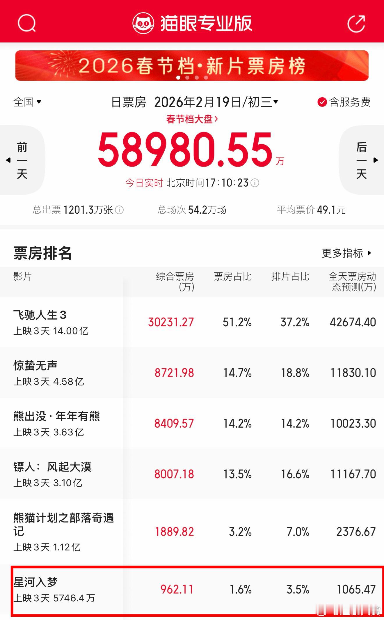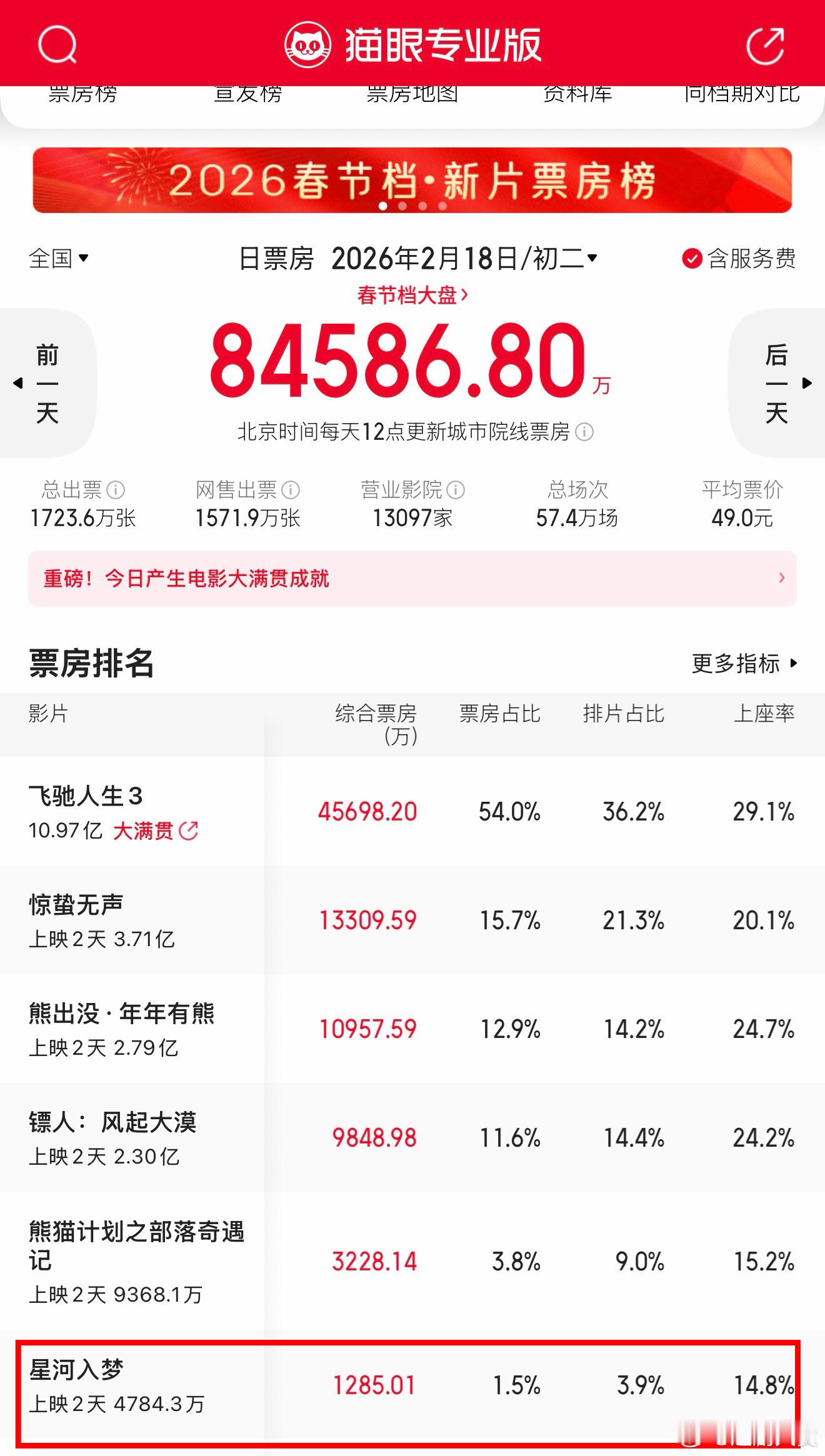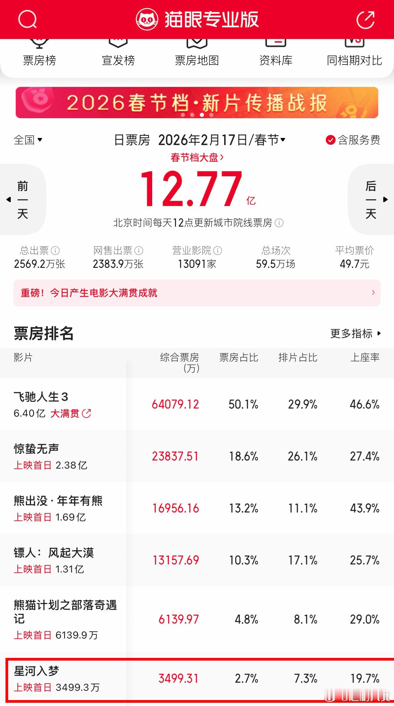 星河入梦排片占比截至目前星河入梦三天的排片占比:初一排片7.3%票房2.7%,初二排片3.9%票房1.5%,初三排片3.5%票房1.6%