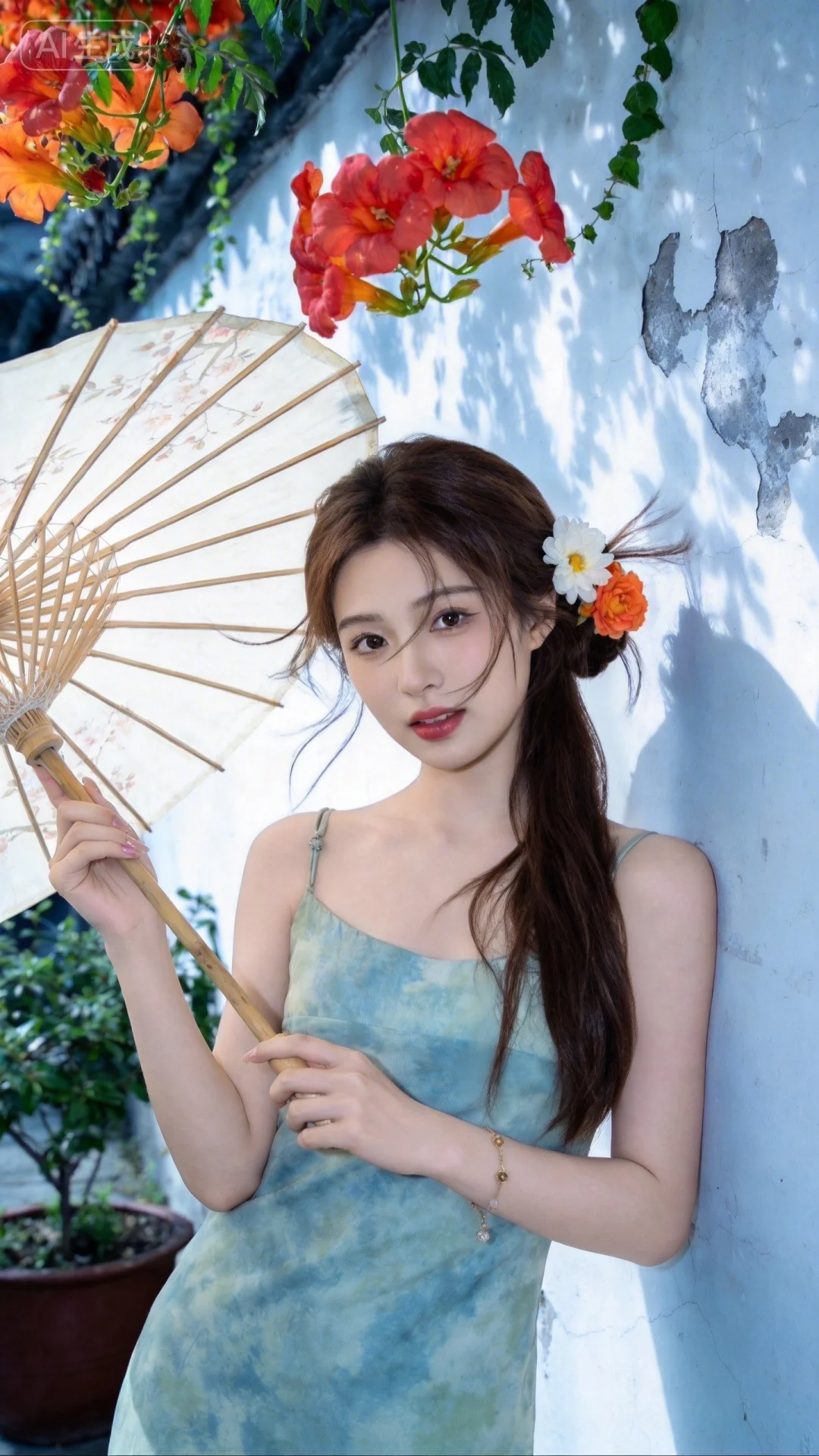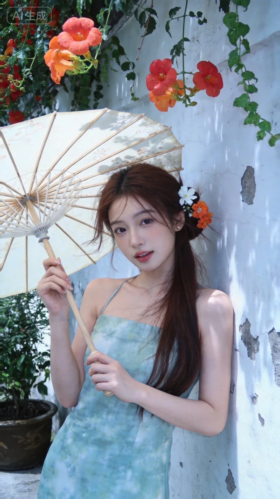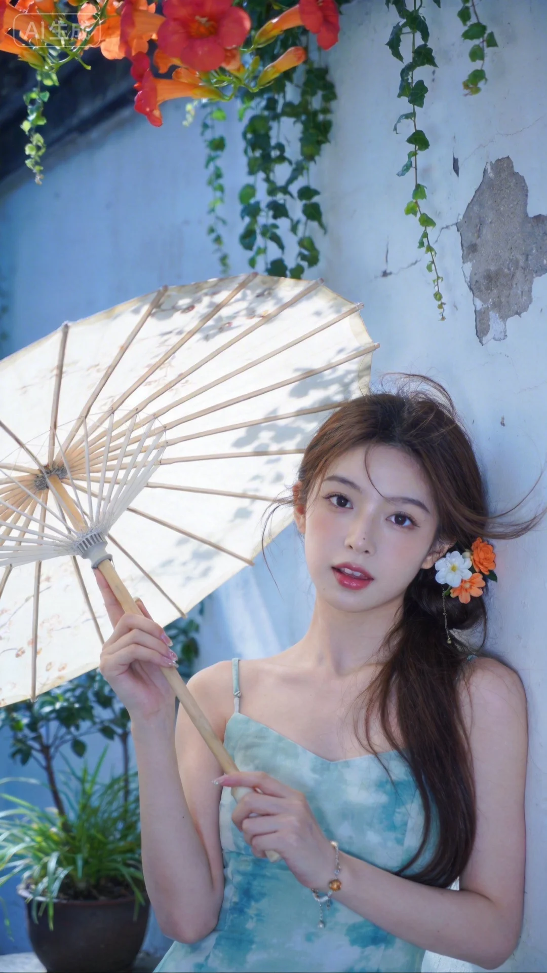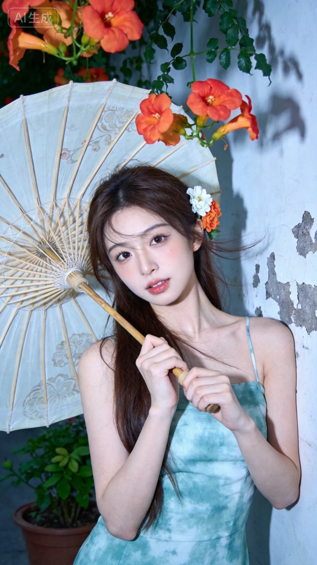 真实摄影,棕色长发(一侧插有白色与橙色花朵发饰),穿着浅蓝绿色扎染风连衣裙,手持米白色油纸伞(伞面有花纹),倚靠在带有剥落痕迹的白墙旁,上方垂落着橙红色花朵与绿色藤蔓,旁边有盆栽绿植,整体风格清新、文艺,充满自然与复古融合的氛围感,19岁江南美女子,东方美女,高颜值纯欲少女,idol气质,脸型精致,精致脸蛋,(电影级面光:1.6),(光线追踪:1.5),(冷白皮漫感质感的光滑皮肤:1.7),(人物有最好的骨相:1.2),(网感脸:1.6),身材完美,莫兰迪配色,高颜值网红,INS风,幼态脸,19岁女生尖下巴,三庭五眼比例均衡,身材娇小,细腻陶瓷水嫩肌肤,偏冷白皮,随机的妆容,随机的饰品,随机的动作,侧光,发丝轻飘,凌乱,随机角度拍摄,总体有很多的不确定性,但又好看,