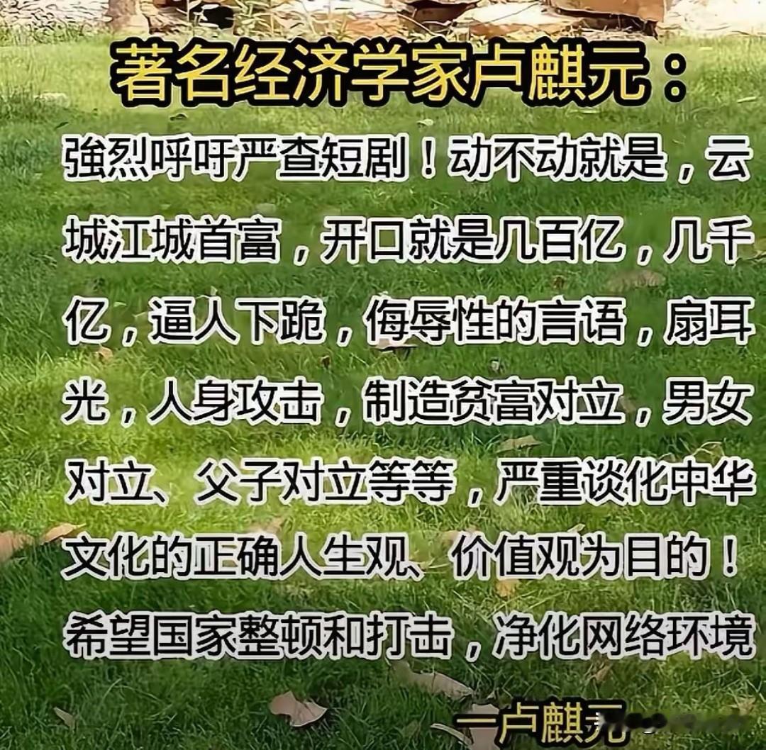 卢麒元大年初三呼吁严查网络短剧。 2026年大年初三,经济学家卢麒元公开提议整治网络短剧乱象。短剧多以虚构城市为背景,渲染百亿千亿财富场景,包含下跪、辱骂、掌掴等侮辱行为。短剧刻意制造贫富、男女、代际对立,扭曲正确价值导向。 短剧剧情高度雷同,聚焦豪门恩怨与逆袭打脸,宣扬金钱万能观念。普通人长期观看易否定奋斗意义,产生不劳而获心态。青少年辨别能力不足,易模仿剧中偏激粗鲁言行。 低俗短剧如同精神毒瘤污染网络环境。平台严格审核内容,清理违规作品。监管部门启动全流程整顿,上调制作门槛,处罚违规制作传播方。民众瞅准内容边界,远离低俗爽剧,接触正向信息。 行业合规化进程提速,劣质短剧生存空间持续收缩。 大家咋唠这件事?
