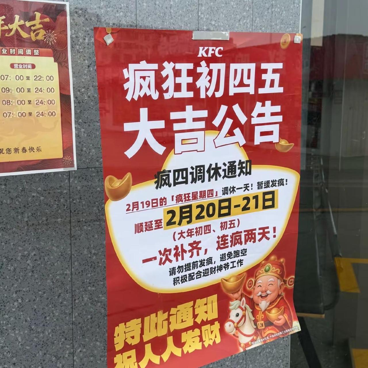 今天居然没有“疯狂星期四”我说今天怎么没有疯狂星期四,原来是肯德基调休了!😤有没有搞错啊肯德基,你是年过舒服了,我们的快乐谁来管?行吧,先忍一天,初四初五连疯两天记得补上!吃喝玩乐分享计划 肯德基 疯狂星期四