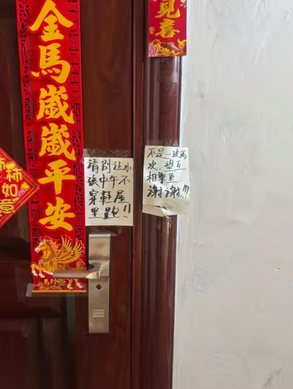 网友说大年初一被邻居贴了小纸条。他看了很生气。 纸条上写着:请别让小孩中午不穿鞋在屋里跑。已经不是一次两次了。请互相尊重,谢谢!网友说,起码过了年再说呀。 楼下估计是老夫妻。中午要午睡,孩子在屋里跑,听得很清楚,影响了他们的休息,被逼无奈才上门告知。贴纸条也是一种尊重,避免当面指责。而且他们很讲道理,最后还说了谢谢。 网友不知悔改,居然生气,气从何来?本来打扰别人就不对。管好孩子才是王道。