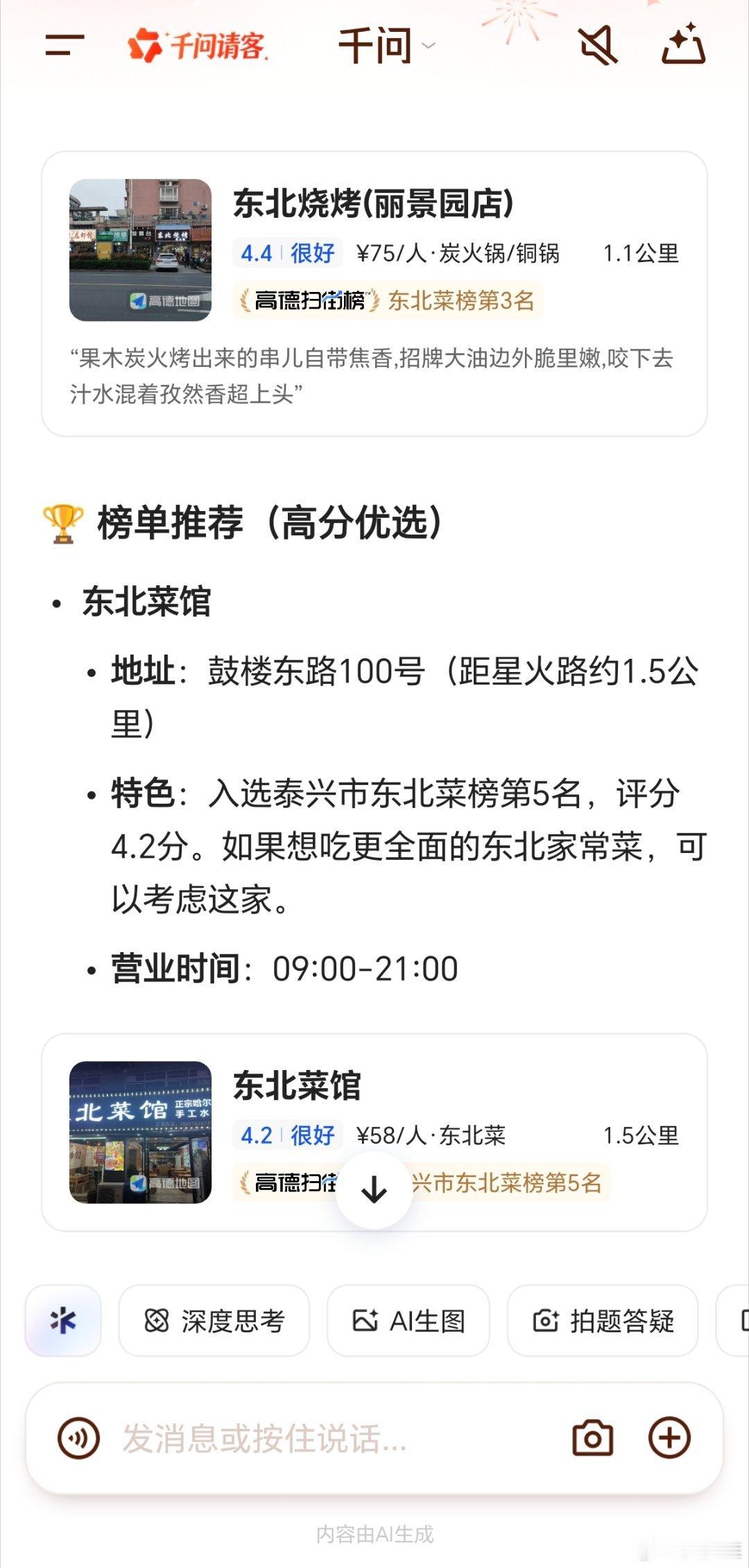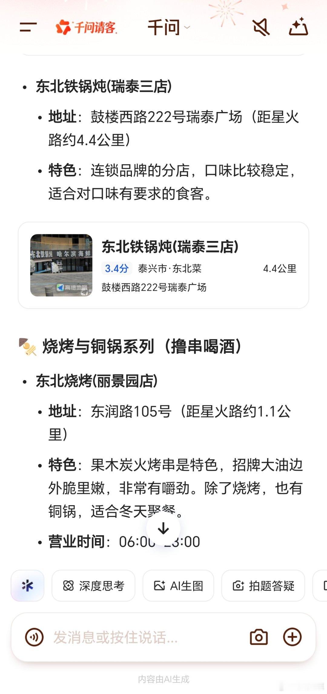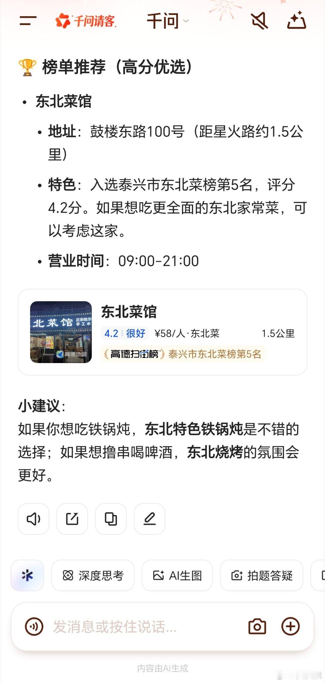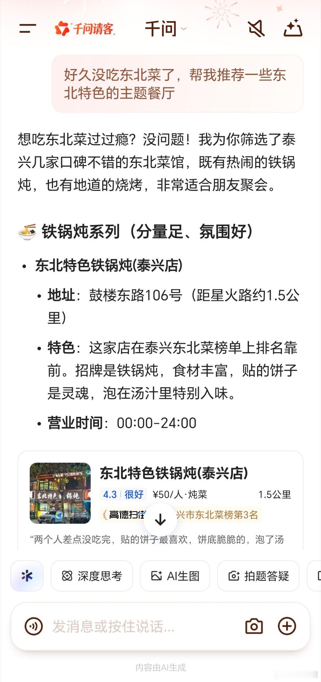记得两年前,我东北一哥们结婚,吃的东北菜口味不错,我就试着让千问帮我推荐了一家地道的东北菜。