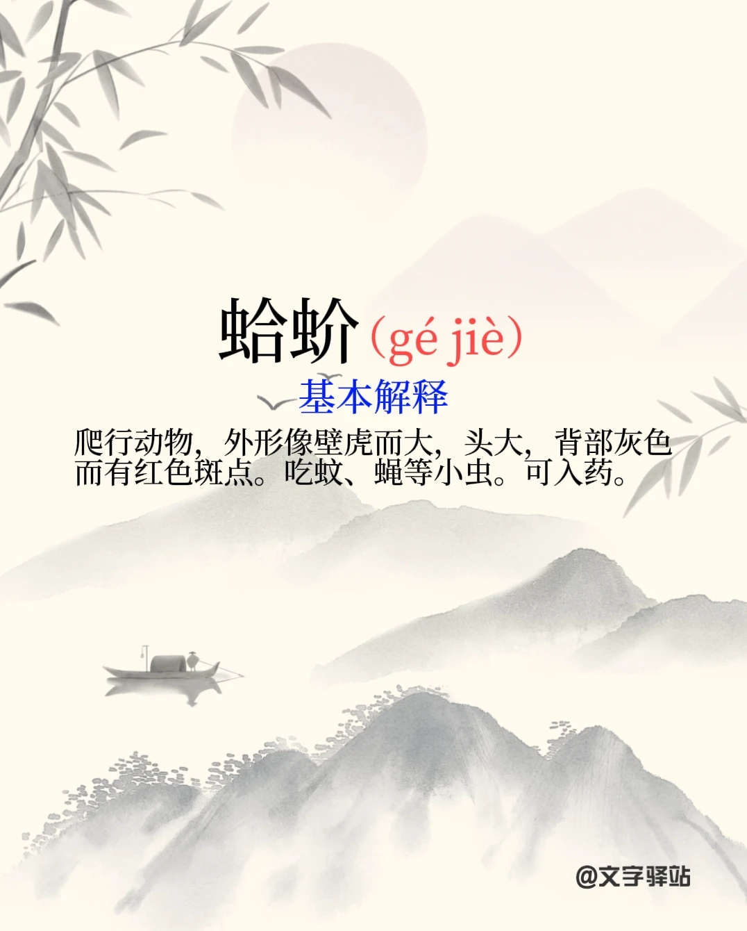 拾起文字 汉字之美 字词积累 容易读错的字 汉字 普通话 打卡 每天学习一点点 【中药材读音·第5期】 本期药材:蛤蚧 蛤蚧的干燥体,性平,味咸,归肺、肾经,具有补肺益肾、纳气定喘、助阳益精的功效,临床常用于肺肾不足、虚喘气促、劳嗽咳血、阳痿遗精。 图片左滑查看正确读音哦[斜眼R] [种草R] 注意,“蛤”字还有一个读音:há。用于蛤蟆 (青蛙、蟾蜍的统称)。