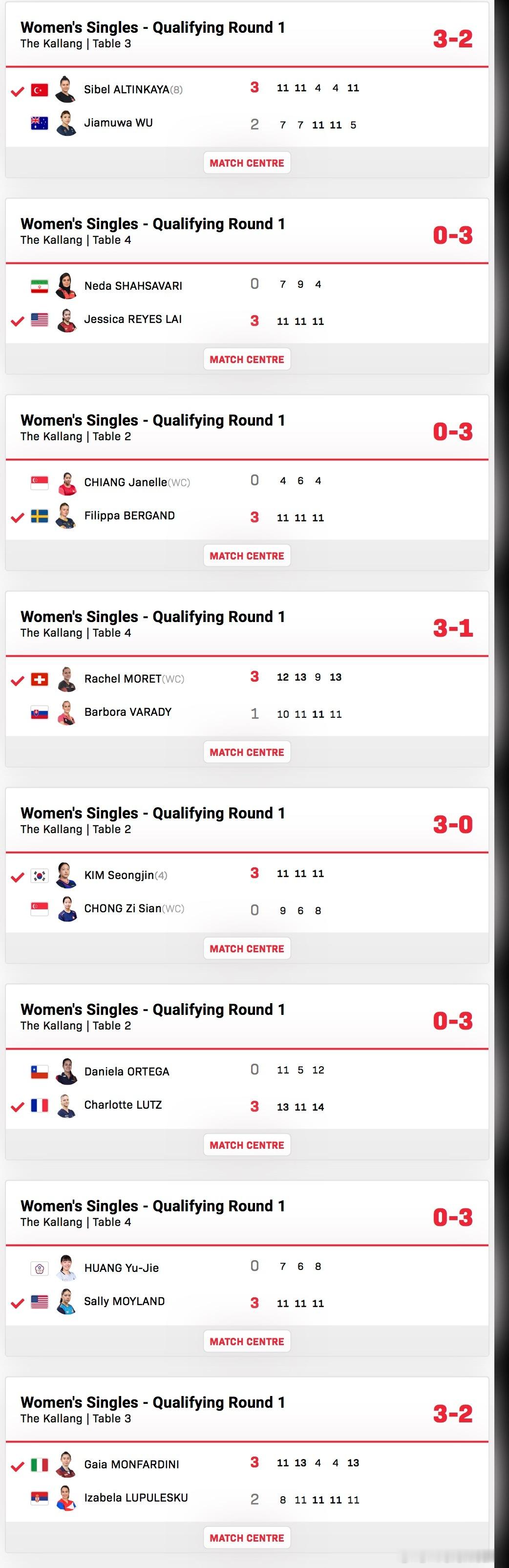 蒙法蒂尼3-2卢普莱斯库莫兰德3-0黄愉倢夏洛特3-0丹妮拉金成珍3-1钟子珊菲利帕3-0张洁内尔雷耶斯3-0内达西伯尔3-2吴家牧娃万远3-0库库洛娃奥拉万3-0曾志英渡边劳拉3-1维嘉