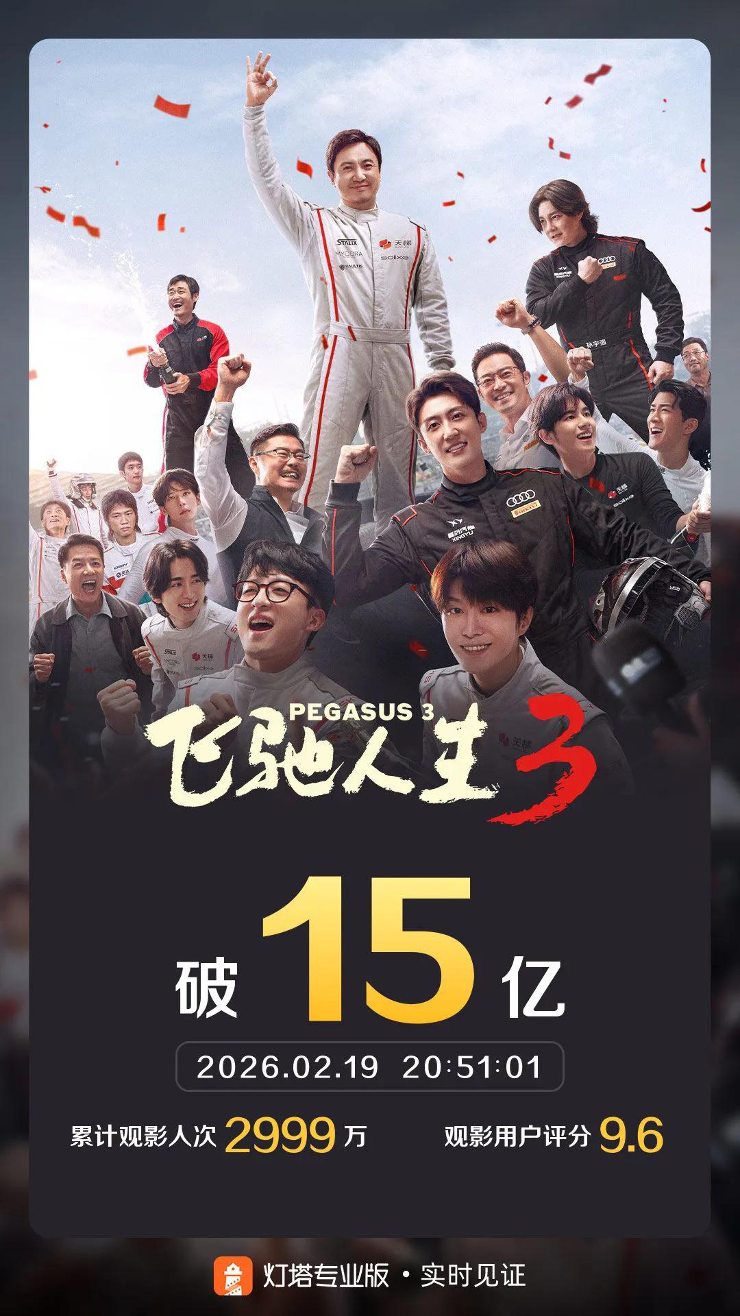 《飞驰人生3》票房破15亿,超越《夏洛特烦恼》。 由韩寒执导,沈腾、尹正、黄景瑜、张本煜领衔主演,魏翔、沙溢、范丞丞、孙艺洲主演,段奕宏特邀主演,张新成、胡先煦、李治廷、白宇帆、周政杰、高华阳特别出演,贾冰、王安宇、陈永胜、冯绍峰、郝瀚友情出演的喜剧电影《飞驰人生3》累计综合票房破15亿,超越《夏洛特烦恼》、《送你一朵小红花》、《魔兽》、《我和我的父辈》等片,进入内地影史票房总榜65强;超越《熊出没·伴我“熊芯”》,进入春节档历史22强。 一方面得益于前作的观众基础,另一方面也得益于对手的实力不够强,《飞驰人生3》在2026春节档大杀四方,如入无人之境。而节后的3月份暂无重量级电影定档,春节档影片的余量空间会比较充足。飞驰人生第三部 飞驰人生3争议