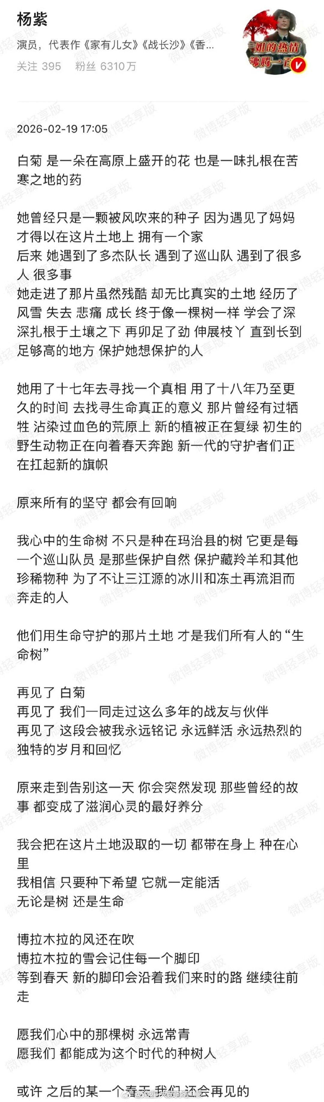 杨紫发长文告别白菊