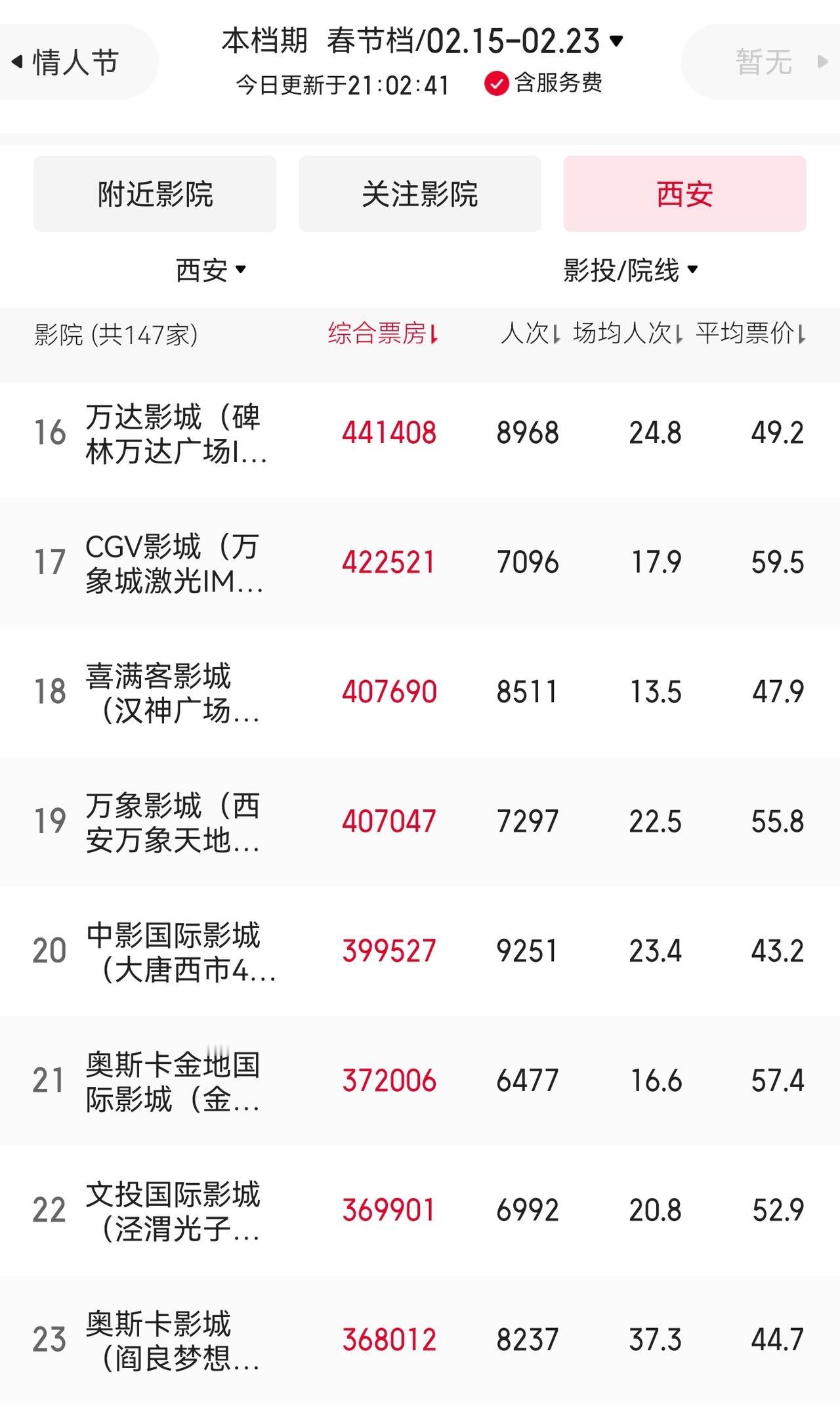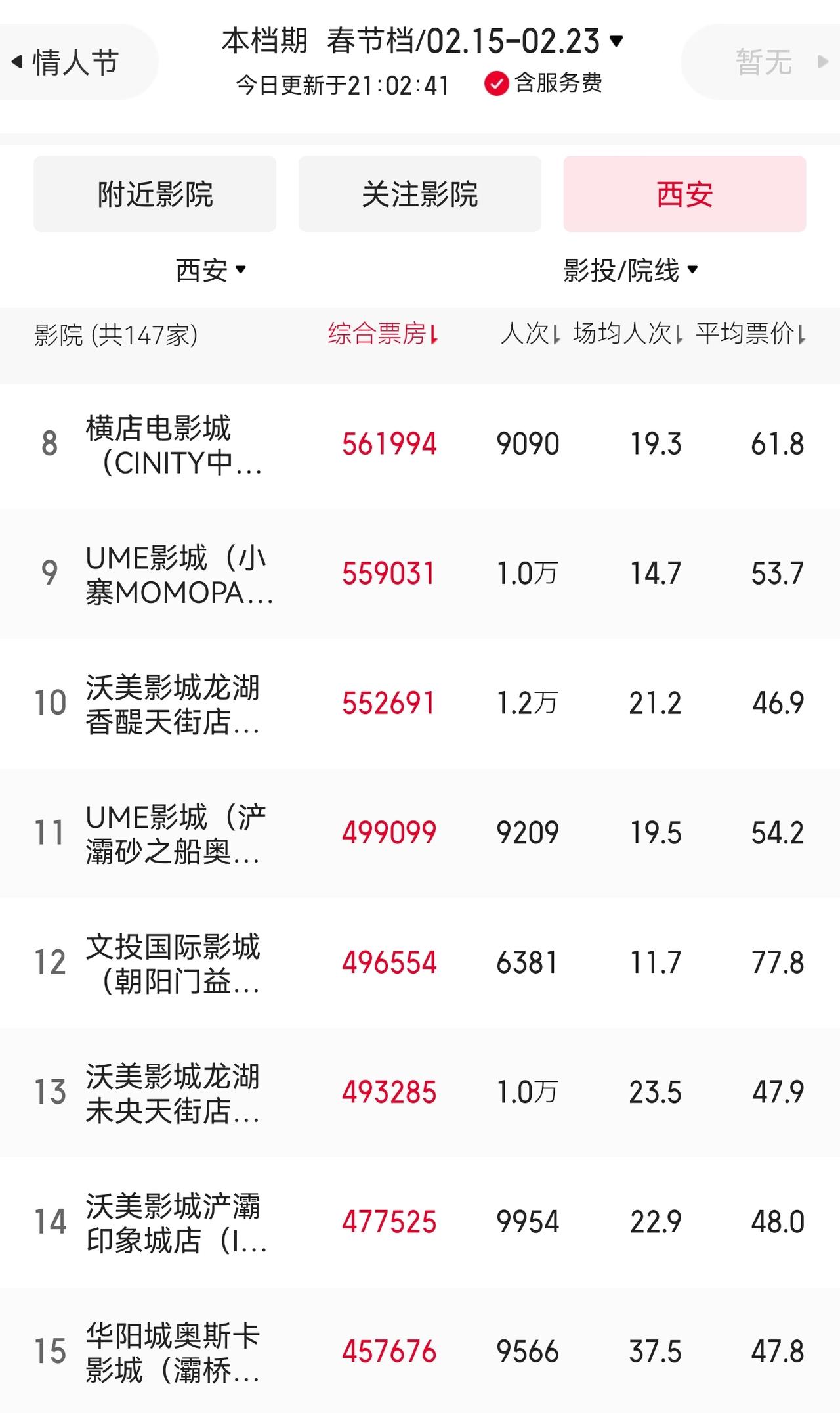 2026春节档过半,全国总票房突破30亿元,西安市场情况如何?平台数据显示,目前西安春节档票房(含预售)超过3500万元,平均票价47.9元,相较去年下降近2元。影院方面,全城在营数量147家,其中票房TOP10门槛提升至50万,前五依次为熙地港、大明宫万达、高新万达、大悦城博纳与荟聚寰映。