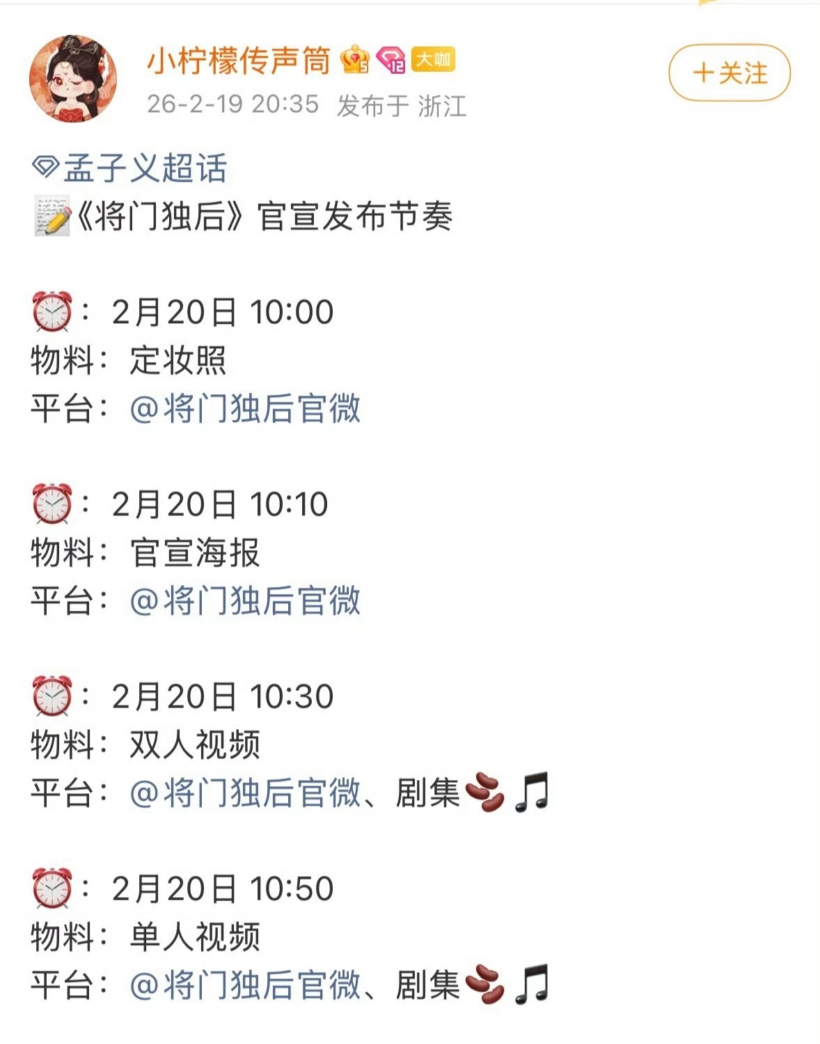 将门独后明天就要官宣了,不知道孟子义和王鹤棣的番位如何!