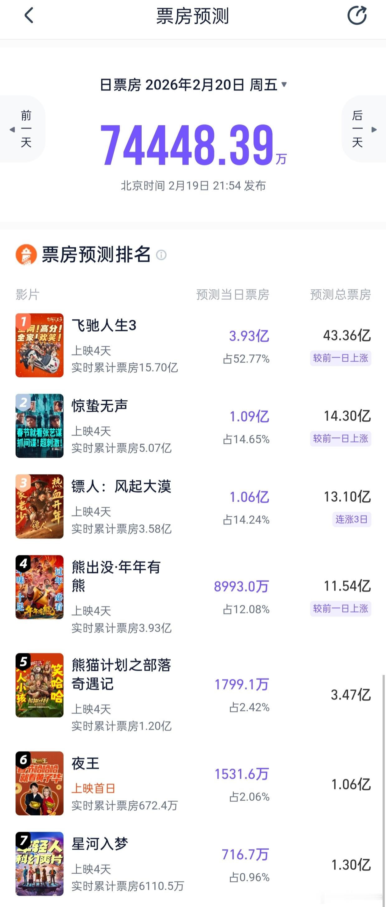 听听温特怎么说 灯塔专业版预测明天初四票房7.4亿,新片《夜王》总票房预测过亿。