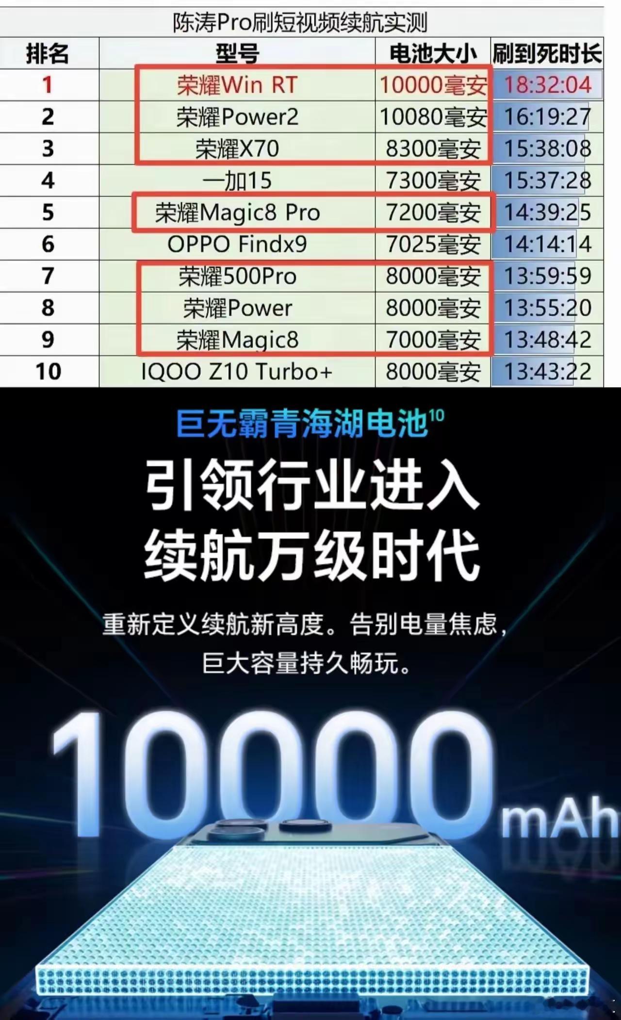 估计手机行业到最后还是要卷续航,前十榜单荣耀就有7个,独占鳌头了属于是,依照这趋势出门感觉充电宝都可以淘汰了。
