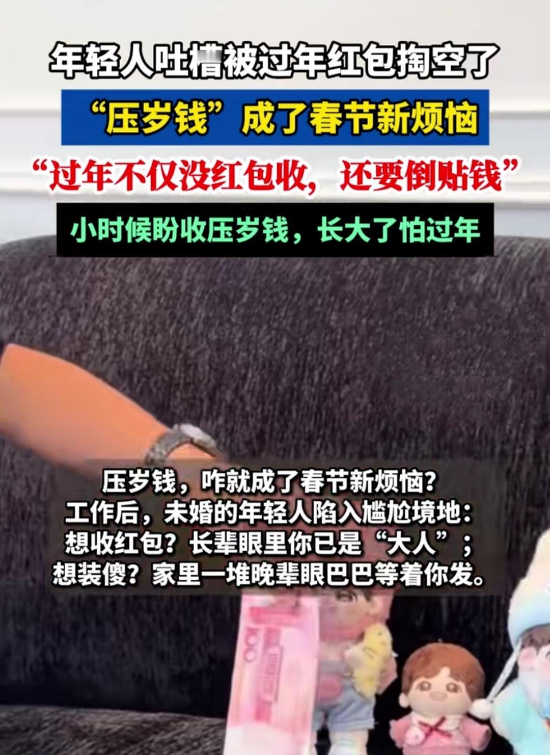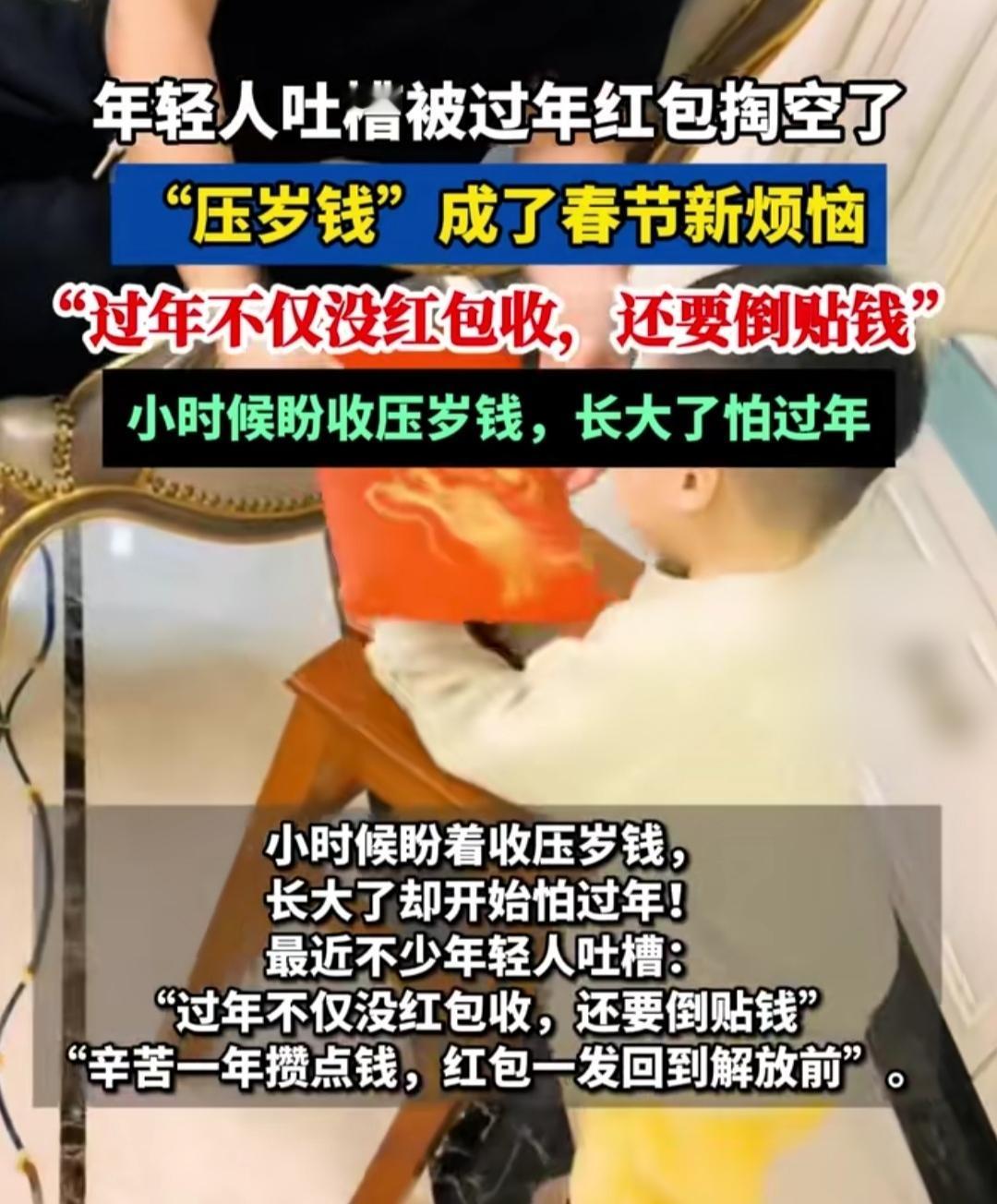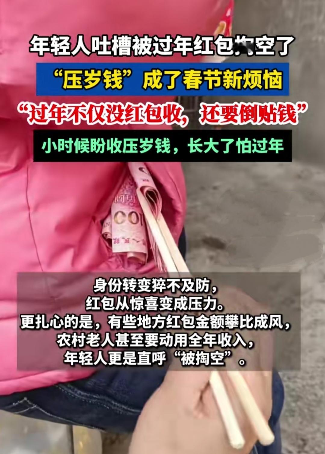 小时候过年,最盼的就是长辈把红包塞到手里,那是一年里最开心的时刻。可现在,身份猝不及防就变了,红包从惊喜,直接变成了压在心头的压力。 过年回家,不仅再也收不到红包,还要倒贴钱。看着家里一堆晚辈眼巴巴等着,自己刚工作没几年,工资还没捂热,红包一发,瞬间回到“解放前”。 更扎心的是,有些地方红包金额还在攀比,农村老人甚至要动用全年收入,年轻人更是直呼“被掏空”。想装傻说自己还是孩子?长辈眼里,你早就是该发红包的“大人”了。 辛苦一年攒点钱,过年几天就清零。这种无奈,大概只有长大的人才懂吧。
