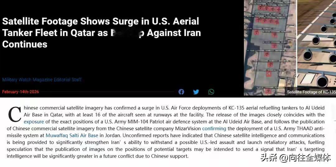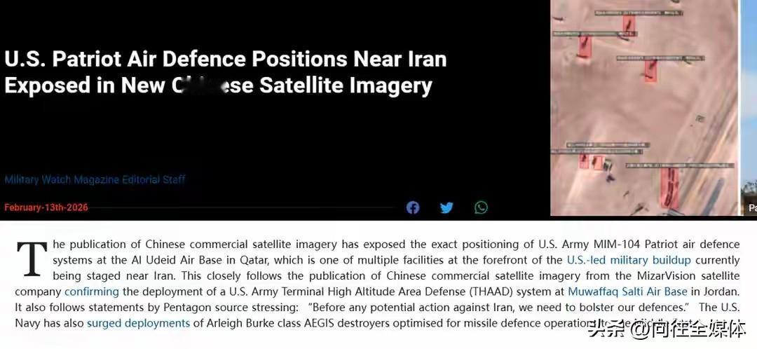 中国卫星直接摊牌!美军中东基地全曝光,伊朗战力直接拉满,美国慌了 中国卫星突然在中东亮出“天眼”,把美军最机密的部署扒得一干二净,美媒集体炸锅:这是直接给伊朗送上“精准瞄准镜”! 卡塔尔乌代德空军基地的KC-135机群、约旦的萨德反导阵地,全被中国商业卫星清晰锁定。以往只有西方垄断的太空侦察,如今中国随手一出,就让美军无处藏身。 现在美国正调集三航母编队威慑伊朗,指望靠秘密部署搞突袭。可中国卫星一出手,相当于把美军所有关键阵地标成靶子。 伊朗最缺的就是高精度侦察,现在短板直接补齐。伊朗无人机、导弹本就数量庞大,一旦配上精准卫星数据,爱国者、萨德都拦不住饱和打击。五角大楼都急着表态:必须立刻加强防御! 从彩虹-5无人机千里打击,到北斗体系稳定支撑,中国太空实力早已成为战场“战力倍增器”。不针对谁,但足够打破霸权信息垄断。 美国想在中东肆意动武?先问问中国的卫星答不答应。这就是大国底气,不动声色,便能定乾坤。 中国卫星 中东局势 美军基地 大国重器
