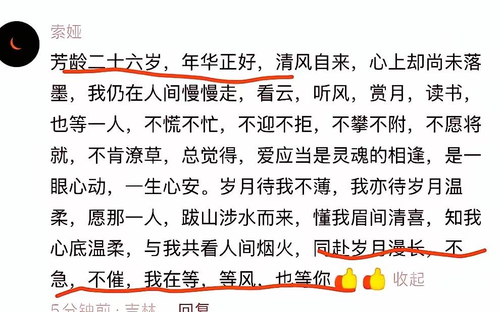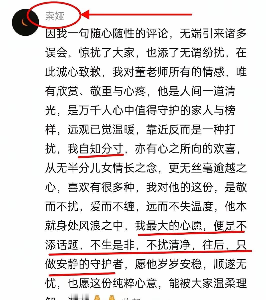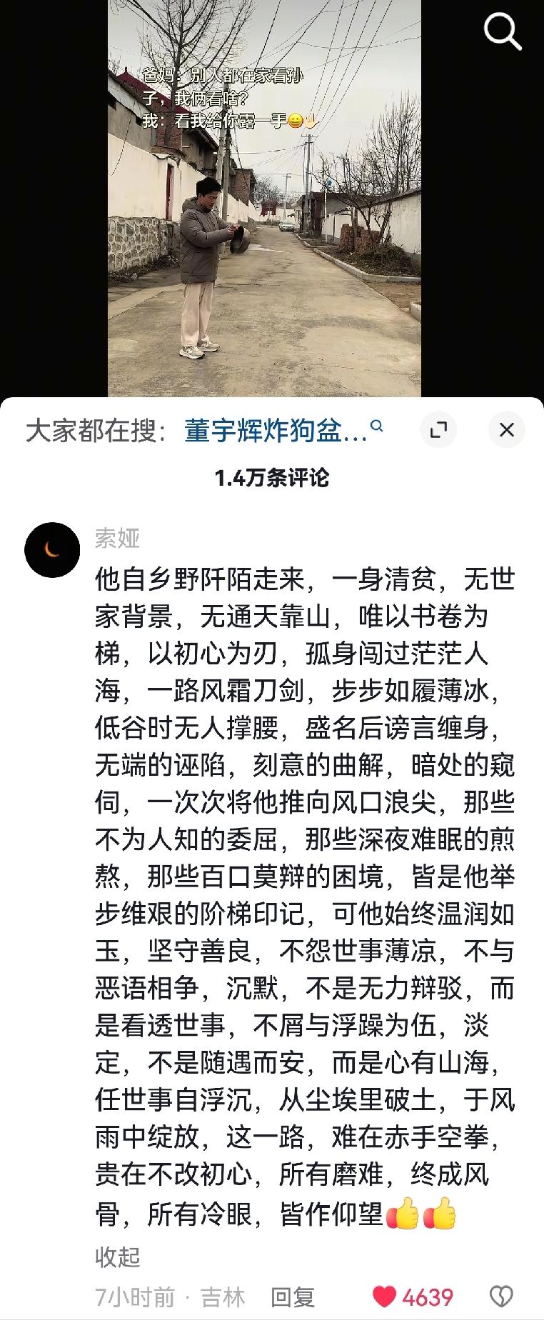 马年董宇辉的桃花运正快马加鞭扑面而来。 博士才女索娅不再矜持,大过年的也穷追不舍,在他放鞭炮的视频下留言,盛赞他温润如玉,坚守善良,仰慕之情溢于言表。 这一个多月,索娅每一次的留言都激起波澜,丈母娘褒贬不一,有人抱怨她没有边界感,有人力挺她,妹妹你大胆的往前走,董宇辉就需要这种破门而入的爱情。 纵观全网,很少见这样的公然表白,董老二的婚事就是个敏感话题,丈母娘早已操碎了心。看他过年三天,不是跟阿猫就是跟阿狗混,要么就在放鞭炮。他就需要这样一个义无反顾冲向他的女孩。而索娅才貌双全,古文功底的造诣尤其令人称赞,都是年轻人,勇敢追求自己的爱情,无可厚非。 愿天下有情人终成眷属,索娅加油,就凭你这份勇气,也配得上董宇辉。