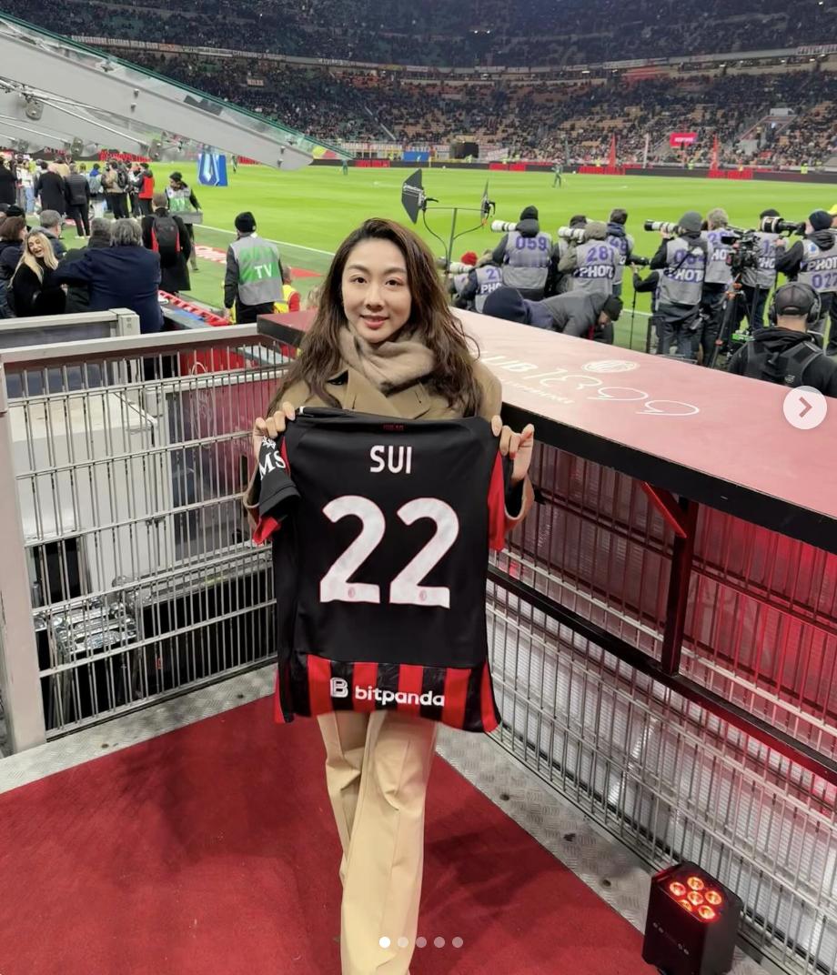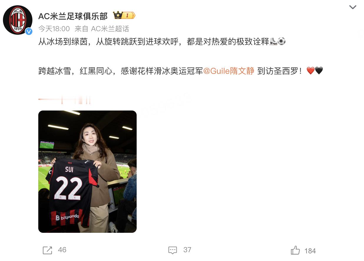隋文静去看AC米兰比赛了 隋文静去圣西罗球场观看AC米兰和科莫的比赛了,隋文静手持印有自己姓氏的22号球衣,背景是圣西罗球场的草坪,AC米兰俱乐部也在微博上发文,表示感谢隋文静造访自己的主场。 AC米兰官方发文欢迎隋文静