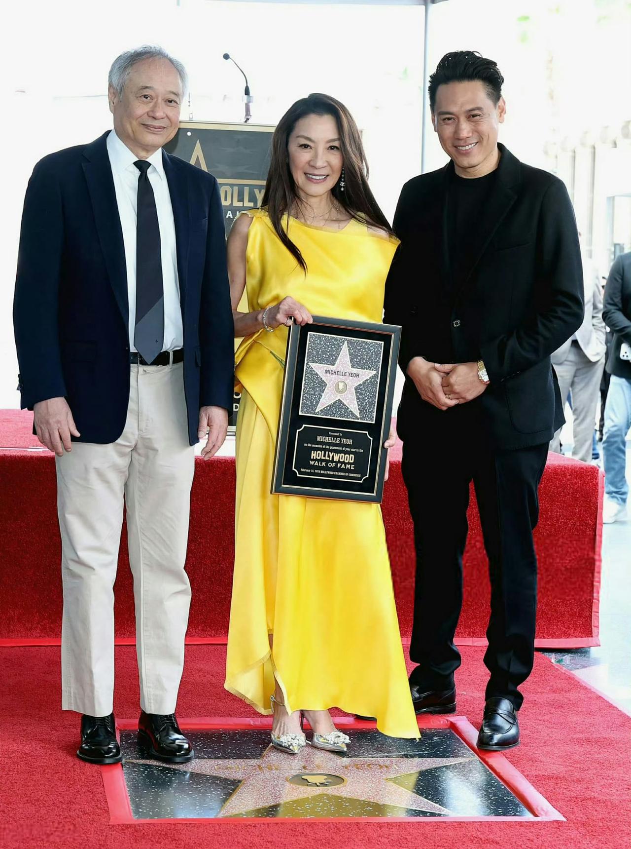 从柏林到好莱坞,杨紫琼的60+人生,每一步都在创造历史✨ 刚在柏林电影节捧回终身成就奖的杨紫琼,又在好莱坞星光大道留下了属于自己的星星。 一袭明黄色长裙,在红毯上明媚又耀眼,像一束光,照亮了亚裔演员在好莱坞的漫长征途。大导演李安、奥卡菲娜、吴珊卓等好友悉数到场,为她见证这一荣耀时刻,也让这场授星仪式,成为亚裔力量的一次盛大集结。 从武打女星到奥斯卡影后,再到如今的星光留名,杨紫琼用几十年的坚持,打破了好莱坞对亚裔的刻板印象。她的60+,没有被年龄定义,反而在每一个舞台上,都绽放出更耀眼的光芒。 杨紫琼好莱坞留星 柏林电影节终身成就奖