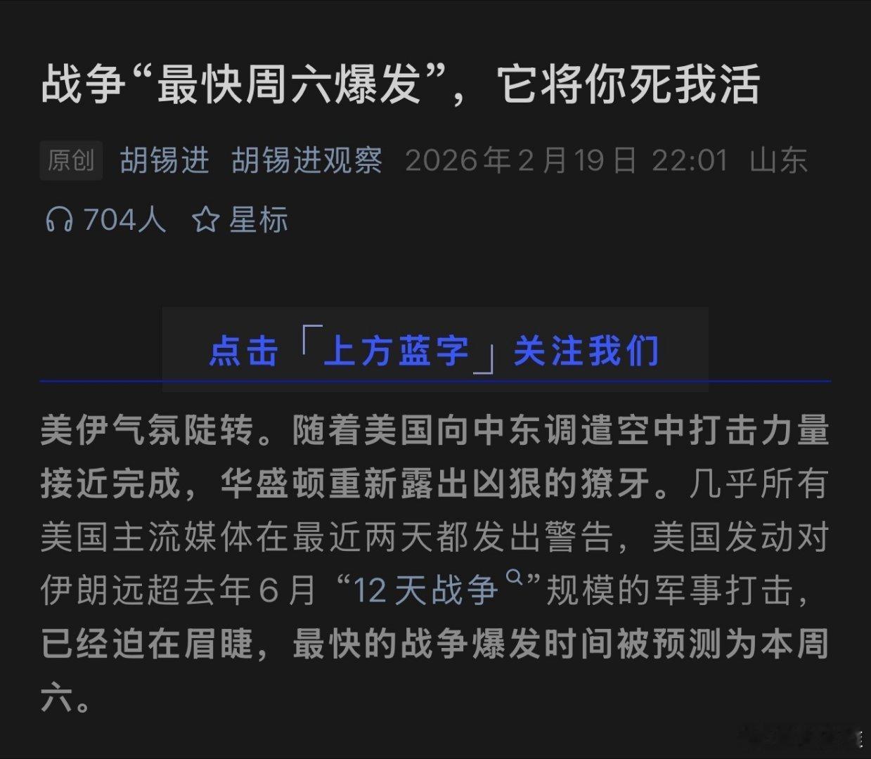 胡锡进称美国轰炸伊朗箭在弦上很多人都觉得美国准备打伊朗了,包括胡锡进。