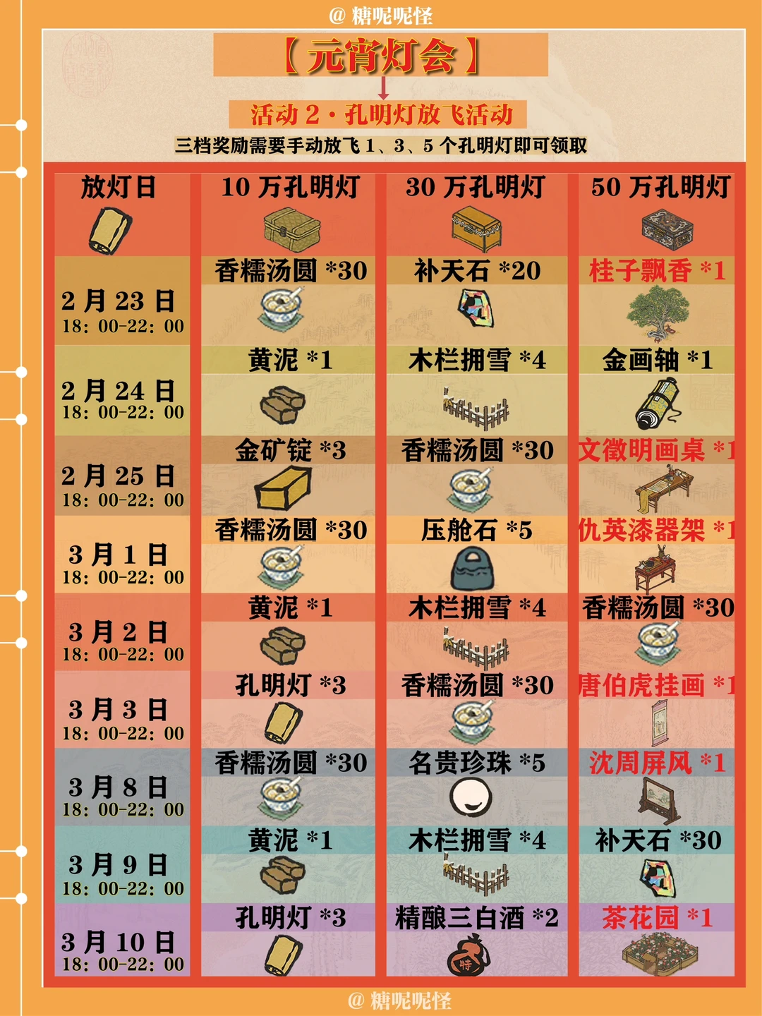元宵节活动共两个: 1️⃣【迎春小屋】获取:18:00开始,游戏右侧直接领取建筑,放置临时建筑,点击建筑完成每日活动,获取【香糯汤圆】,兑换建筑及奖励。 2️⃣【放飞孔明灯灯会活动】活动时间内18:00-22:00,分别放飞1、3、5个孔明灯即可领取活动奖励