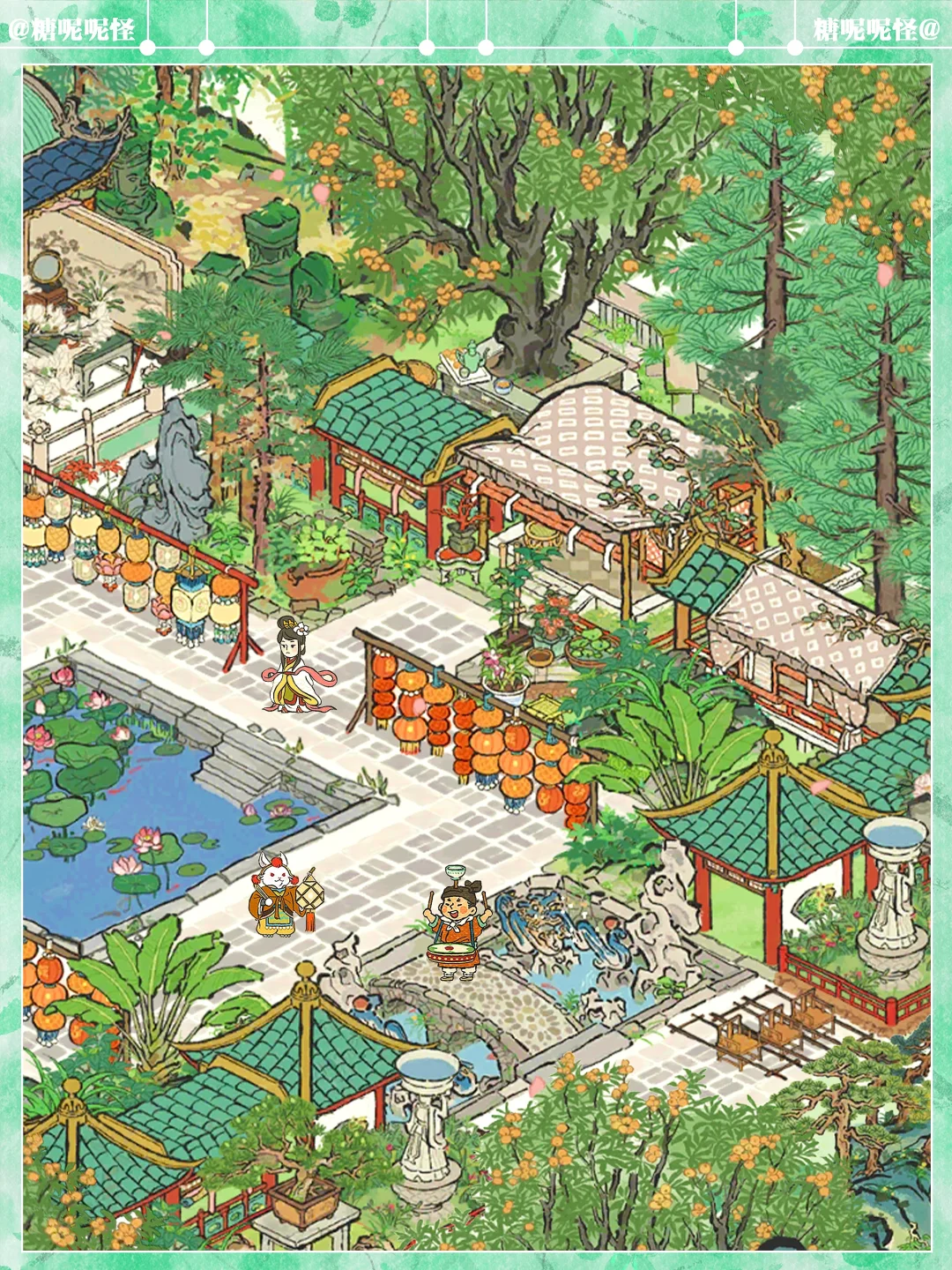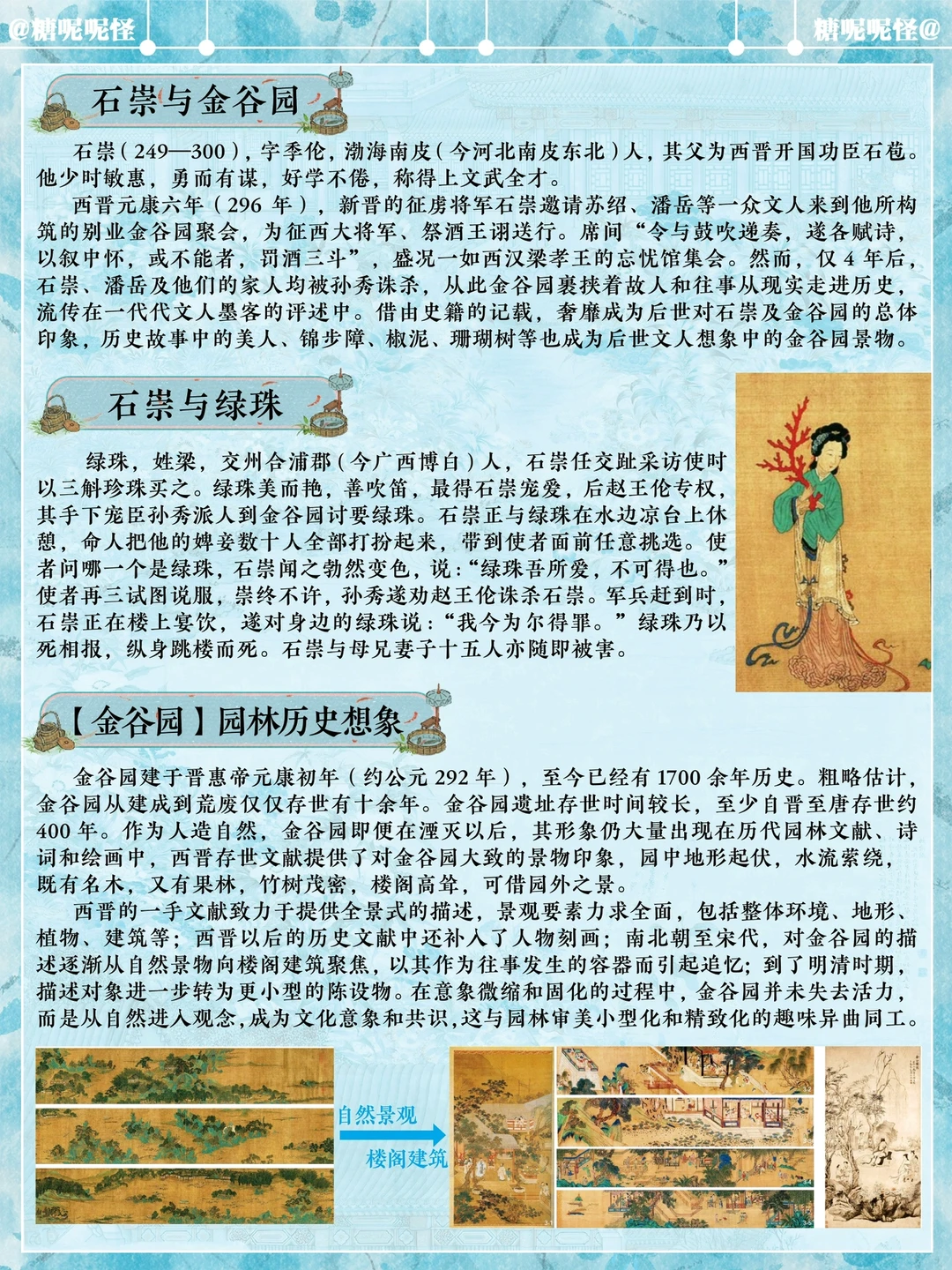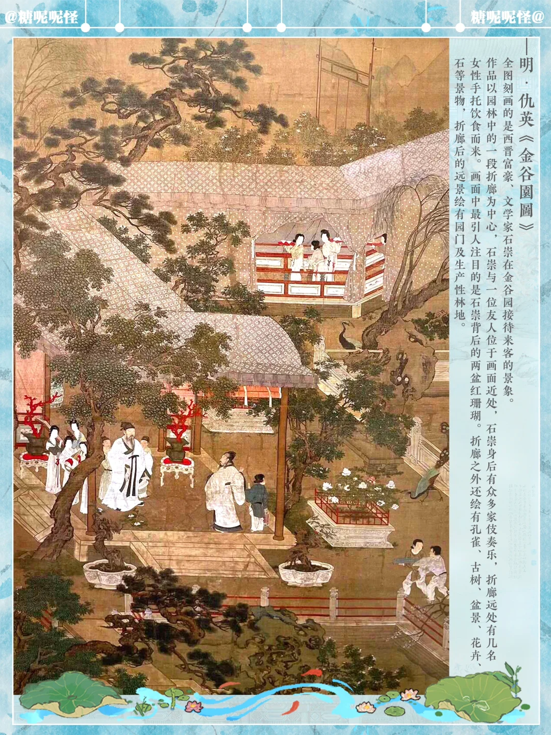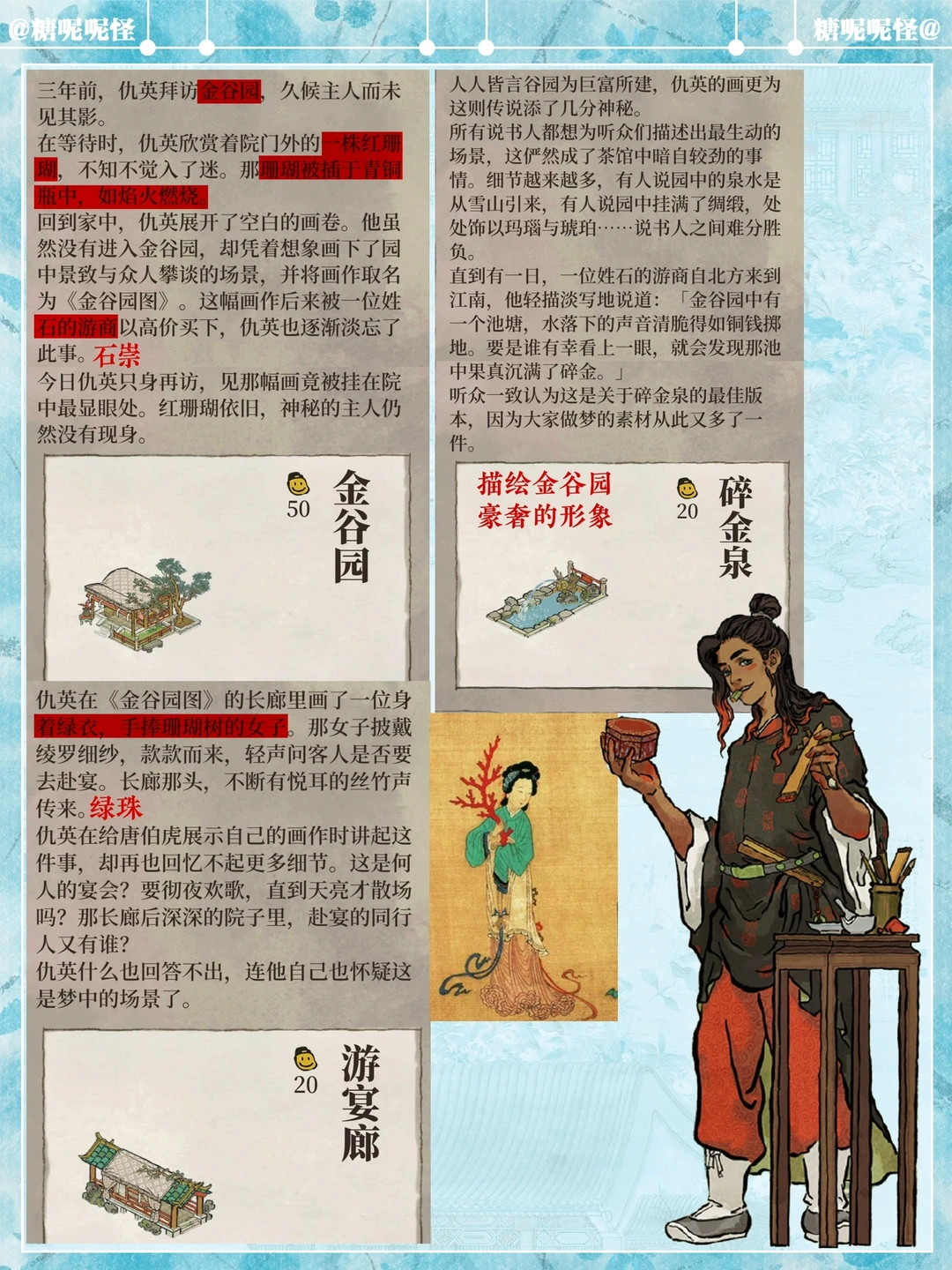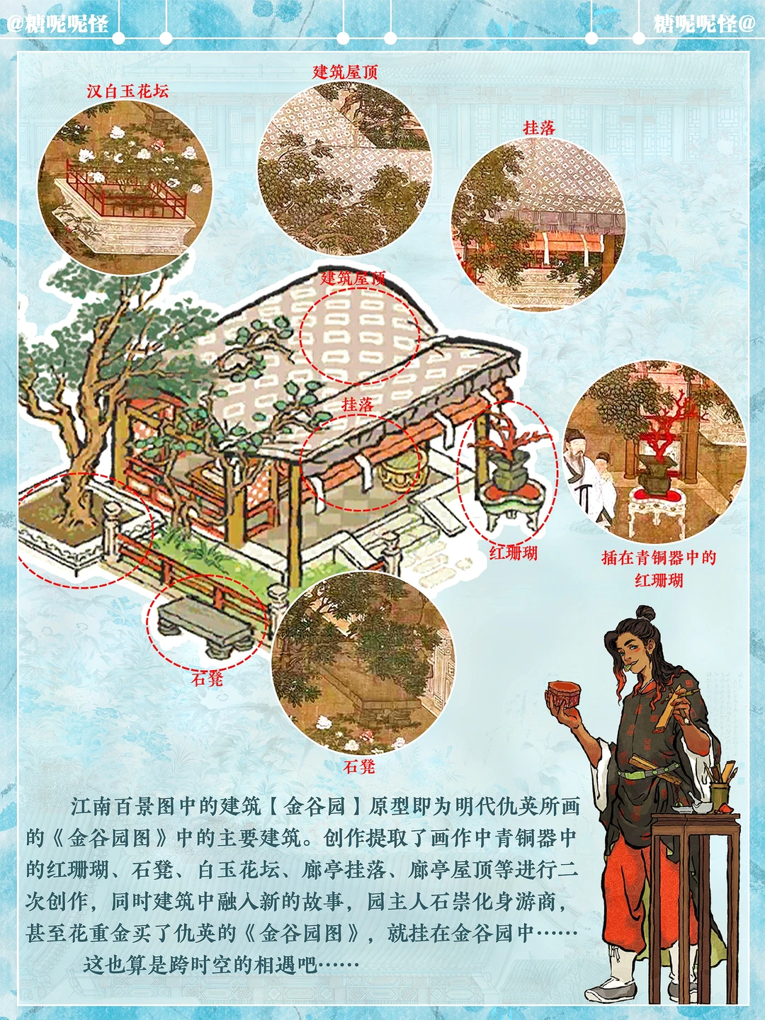 1️⃣繁华事散逐香尘,流水无情草自春。日暮东风怨啼鸟,落花犹似坠楼人。 2️⃣江南百景图中的建筑【金谷园】原型即为明代仇英所画的《金谷园图》中的主要建筑。 3️⃣创作提取了画作中青铜器中的红珊瑚、石凳、白玉花坛、廊亭挂落、廊亭屋顶等进行二次创作,同时建筑中融入新的故事,园主人石崇化身游商,甚至花重金买了仇英的《金谷园图》,就挂在金谷园中……这也算是跨时空的相遇吧……