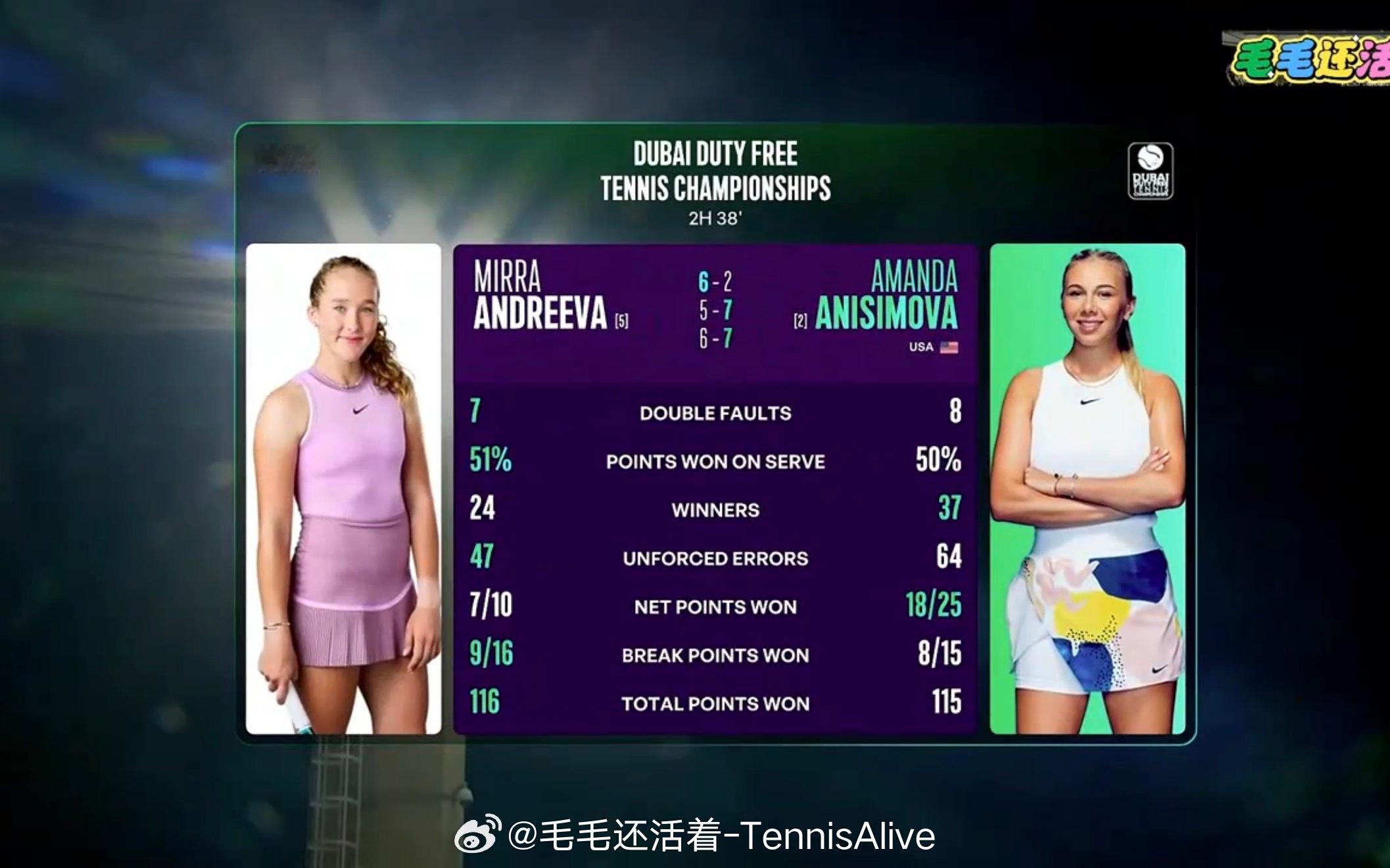 阿尼西莫娃这场比赛打出64记非受迫性失误。安德列娃还是很有机会获胜。但是和多哈一样,关键时刻挂念分自己还是太软。后半段很多时候都在防守等失误。