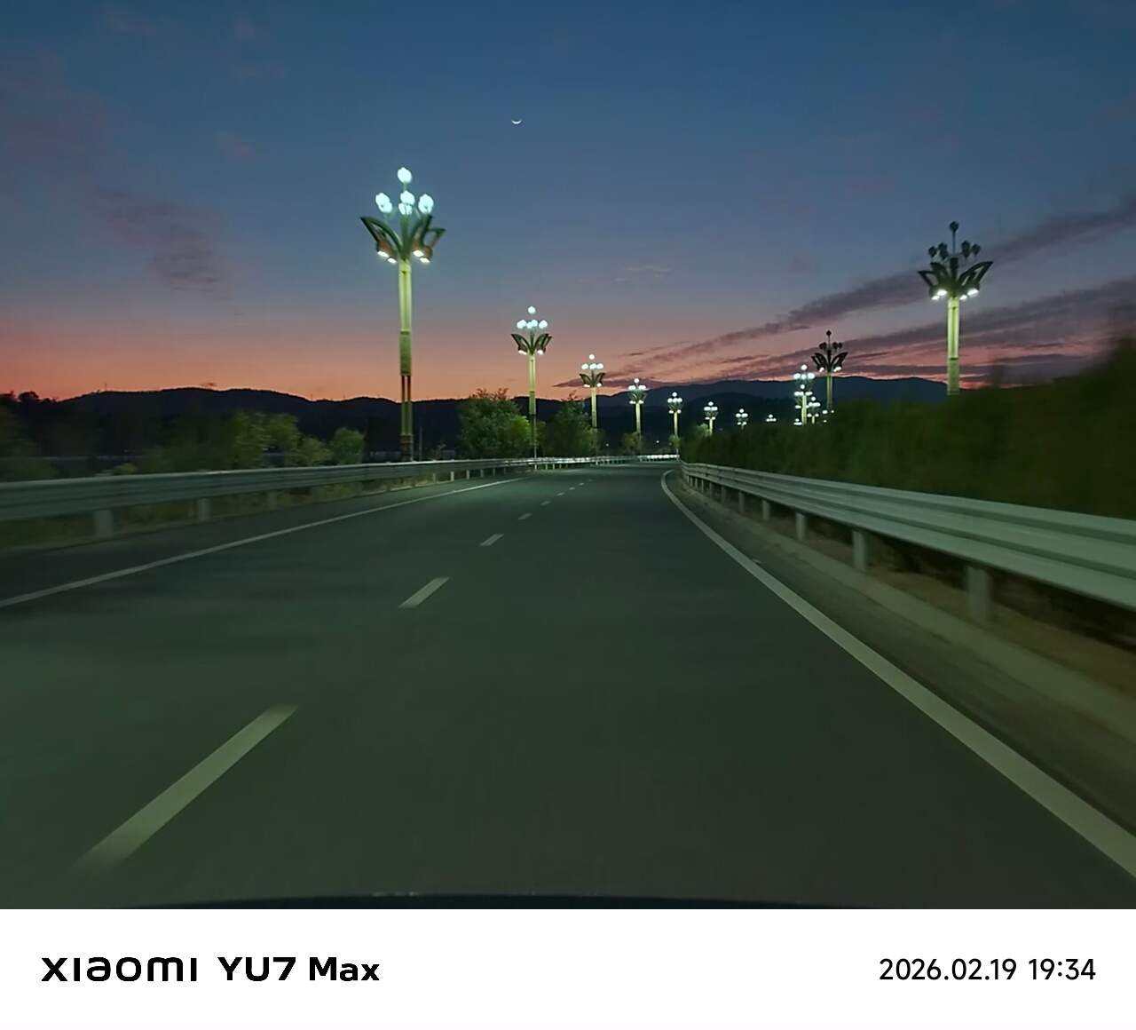 李老师用YU7Max 小爱语音抓拍的这一张图、正好是蓝调时刻、正好月牙弯弯、正好夕阳刚刚落下、蓝色的天空和夕阳橙红色渐变、这张照片太美了!旅途中最喜欢的一张照片
