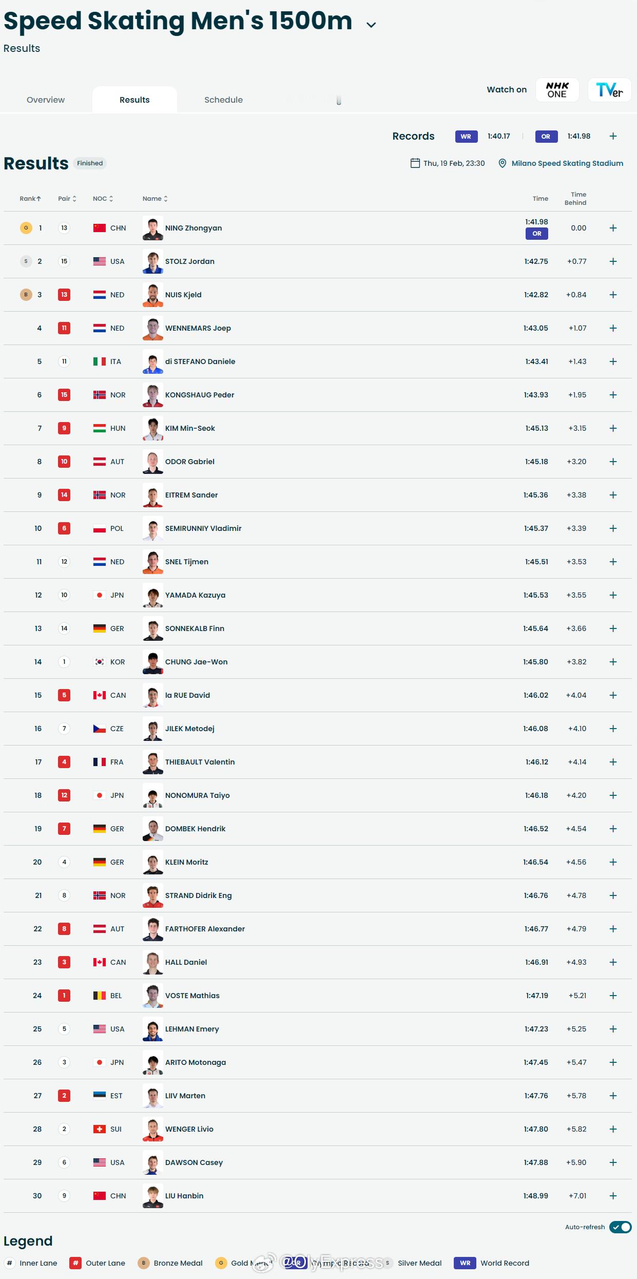 【第三金!速滑男子1500米宁忠岩破奥运纪录夺金】宁忠岩破奥运纪录夺金中国队米兰冬奥第三金宁忠岩金牌 2月19日,冬奥会速滑男子1500米比赛结束。中国选手宁忠岩以1分41秒98打破奥运会纪录并夺得中国代表团第三枚金牌。美国选手斯托尔兹和荷兰努伊斯分获银铜牌。刘瀚彬排名第30。