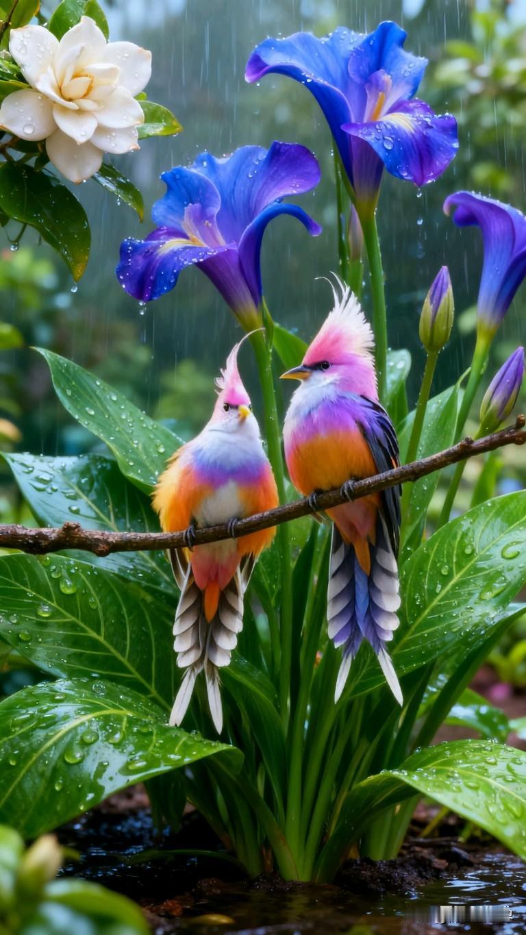 雨中仙境,彩虹鸟儿与蓝紫鸢尾共舞粉色鸢尾紫色蓝蝶