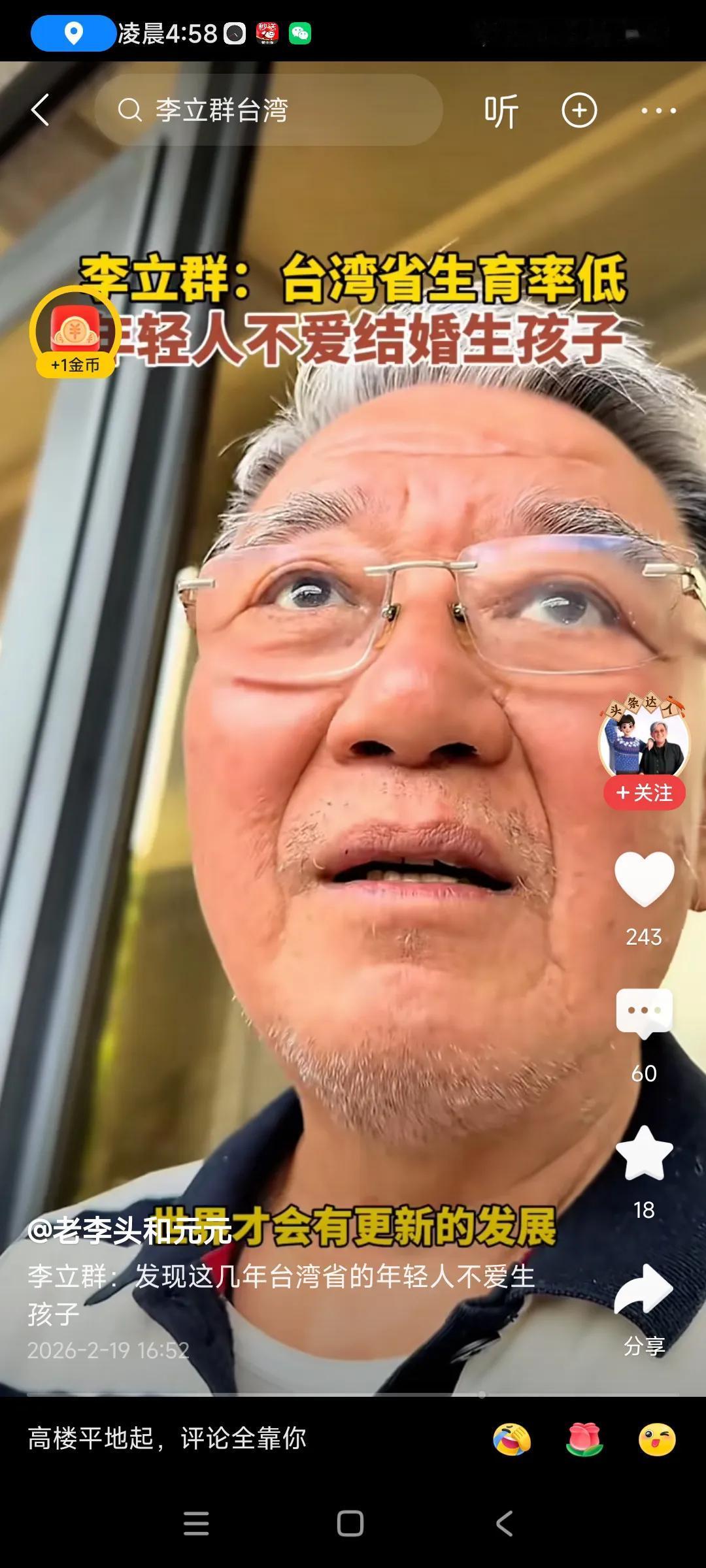 现在很喜欢这个台湾演员李立群,活得通透,想的开,思维敏捷,,, 他认为不管什么工作,挣二千与挣二亿,区别不大,, 挣二个亿的,一顿也吃不了10个牛排,再吃就脂肪肝了,,,,[捂脸][捂脸] 想想有几分道理,条件好的,过年买瓶茅台喝下,条件差一些,买瓶二锅头喝下,,差别也不是特别大,,,