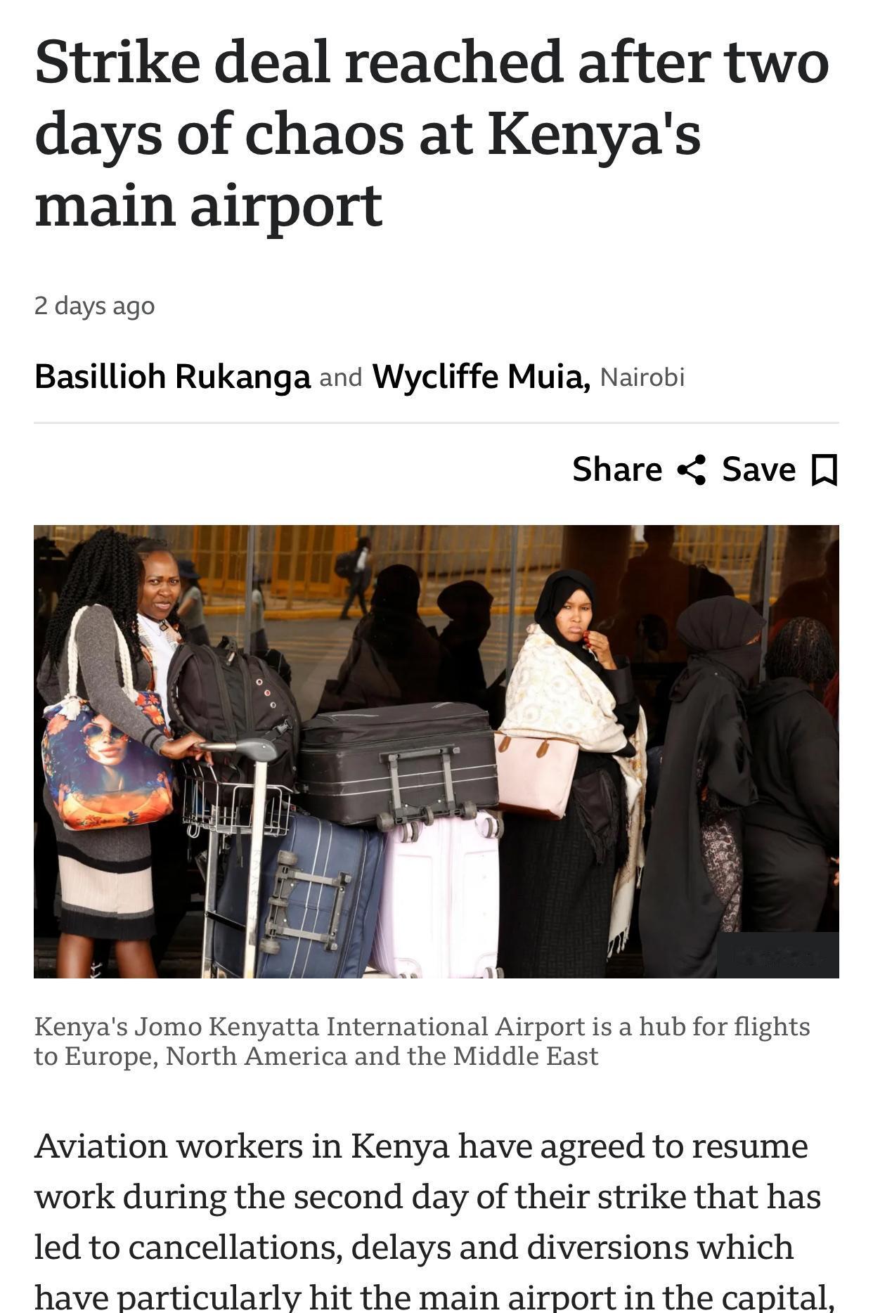 肯尼亚机场罢工记 2月16日清晨,内罗毕的乔莫·肯雅塔国际机场,像被鬼掐了脖子,骤然哑了。肯尼亚航空工人联盟(KAWU)一声号令,工人们扔下工具,空中交通管制瘫痪,飞机趴在地上不动,航班延误、取消,数百乘客如丧家之犬,拖着箱子在候机大厅里踱步,有的竟在地上铺报打盹,熬过二十多小时。 这罢工拖了两日,至17日方休。工会早于2月9日发出七天通牒,法院禁令如废纸,他们照罢不误。 缘由呢?旧恨新仇,一箩筐。集体谈判协议尘封多年,未见执行; 薪资审查拖沓,工龄逾十一年者空等白条; 合同工苦干经年,养老金却成画饼,摸不着边; 更兼工作条件恶化,工会汇款迟迟不至,KCAA(肯尼亚民航局)被指怠慢、歧视,劳资间裂痕如刀口。 当局慌了神,交通部、劳工部、机场当局三方围坐,急急斡旋。工会终签返工协议,机场渐复喘息,肯尼亚航空盼二十四小时内勉强正常。乘客呢?骂声一片,有人怨通知迟钝,有人恨转机断链,经济损失、情感创伤,一并算在“承诺”二字账上。 罢工如一面照妖镜,映出这世道:飞机可停,诺言不可停;机场可乱,人心不可乱。工人们甩手一罢,显出积怨之深;当局速速让步,又见权势之怯。待尘埃落定,机场复飞,然裂痕犹在,谁知下回何时再起波澜? 非洲天空,本该晴朗,却总有阴霾盘桓,叫人叹息。 肯尼亚