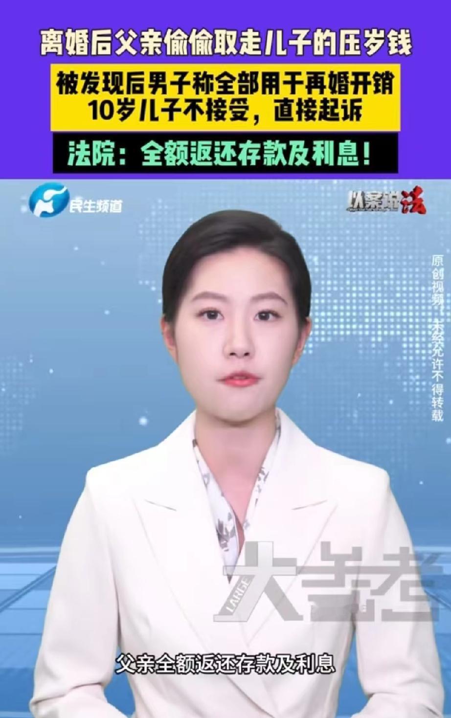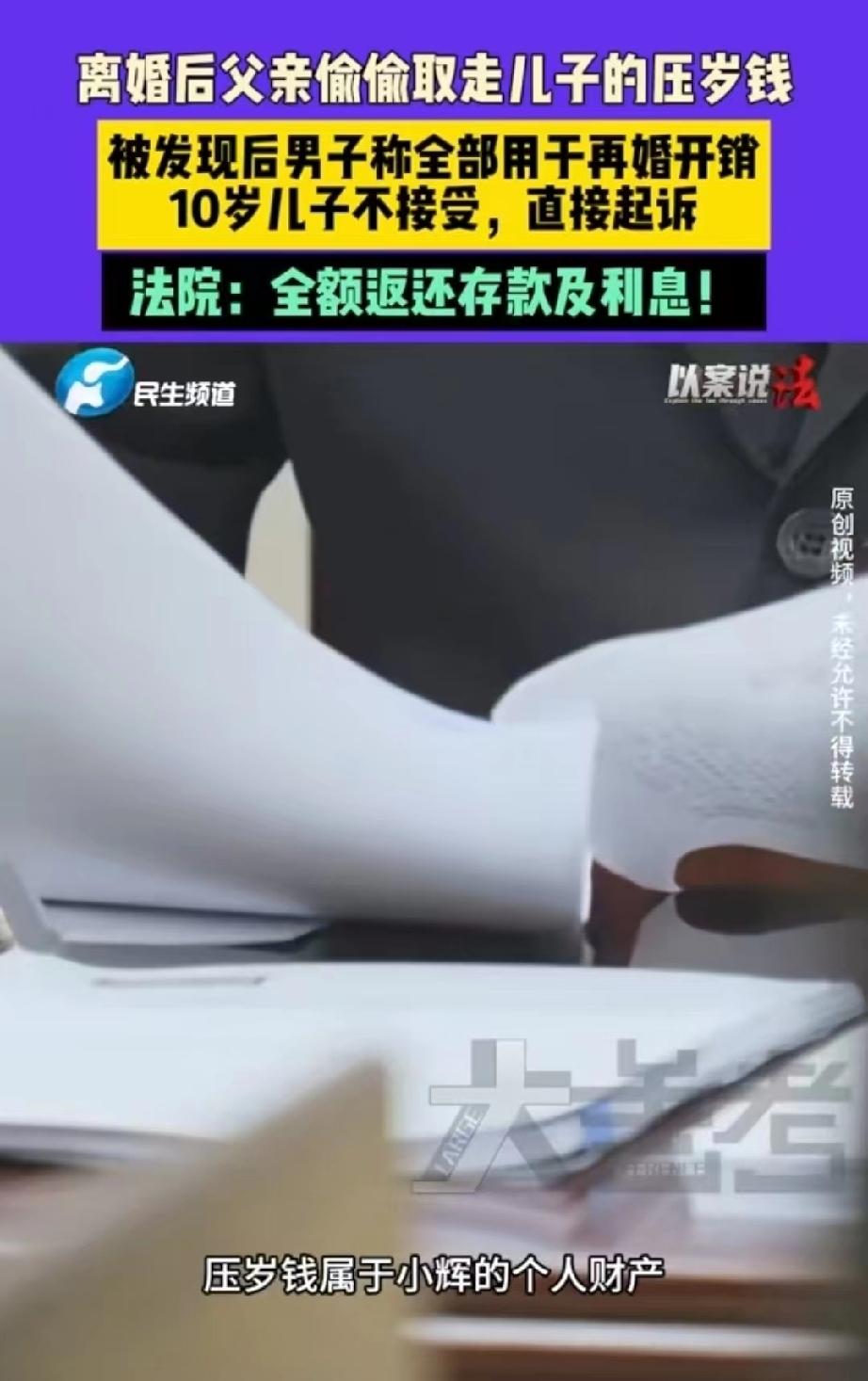 这爹太自私了!河南郑州,父母离异后,10男孩跟父亲生活,不久后,父亲准备再婚,谁知办婚礼时,手头拮据拿不出钱来,便私自挪用了儿子8万多元的压岁钱。有了后妈就有了后爸,母亲怕孩子受委屈,将孩子接走,随后便发现,孩子多年积攒的压岁钱被父亲用作筹备婚礼,顿时怒了,支持孩子将父亲告上法庭,要求返还全部压岁钱和利息,法院判了。 小辉10岁那年,父母因为感情不和离婚,本来无忧无虑的他,生活完全变了。 他跟着父亲一起生活,虽然父亲对他也算照顾,但总不能像母亲那般细致,长期缺乏母爱,让小辉更加敏感。 没过多久,父亲就有了新的交往对象,而且发展迅速,很快就要再婚了。 正当父亲忙着筹备婚礼时,却发现手头拮据,彩礼加上宴请宾客需要不少钱,一时之间他根本拿不出来。 他急得团团转,这时突然想到了小辉攒的压岁钱。 原来,小辉每年过年收到的压岁钱都舍不得花,都帮他存到了一张银行卡里,几年下来,竟然攒了8万多块钱。 父亲觉得,他是孩子的爸爸,用孩子的钱也没什么大不了的,而且压岁钱本来就是用他的钱换来的。 于是,就没跟小辉打招呼,偷偷把卡里的钱取了出来,用在了婚礼开销上。 俗话说,有了后妈就有后爸,父亲再婚后,小辉小处境更是艰难,母亲不忍心孩子受罪,将他接过去一起生活。 后来,母亲无意间得知压岁钱的事情,顿时火冒三丈。 这算哪门子父亲,父母离婚本来就对小辉伤害很大,他跟着爸爸本来就缺少安全感。 谁知,爸爸为了自己再婚,居然偷偷把孩子攒了好几年的压岁钱全拿走,一点都不考虑孩子的感受,也太自私太不负责任了。 压岁钱是孩子的个人财产,不是家长的私房钱,哪怕是亲生父母,也不能随便挪用。 尤其是离异家庭的孩子,更需要被尊重、被守护,别让孩子在失去完整家庭的同时,连最后一点安全感都被亲人拿走。 小辉也觉得,父亲这样做不对,在母亲的支持下,他决定拿起法律武器保护自己,将父亲告上了法庭。 《民法典》第35条第一款规定:监护人应当按照最有利于被监护人的原则履行监护职责。监护人除为维护被监护人利益外,不得处分被监护人的财产。 法院审理后认为,小辉所获得的压岁钱,来源于亲属基于自愿的无偿赠与,自收到时起即属于小辉的个人合法财产,并非父母的夫妻共同财产或父亲的个人财产。 父亲作为监护人,对该笔款项仅享有保管和管理权限,其法律地位是财产代管人,而非所有权人。 父亲在未告知、未征得小辉同意的情况下,私自支取8万余元用于自身再婚彩礼、婚宴等个人开支,明显不属于“为维护被监护人利益”的法定情形。 其行为本质是,利用监护便利擅自处分未成年人财产,已构成对未成年子女财产权的侵害。 最终,法院判决父亲必须全额返还小辉8万多元存款以及产生的利息,共计82750元。
