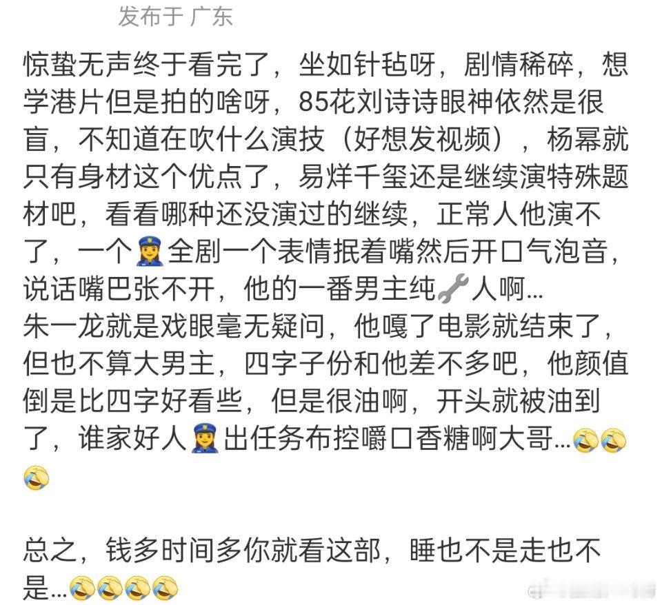网友影评《惊蛰无声》张艺谋想学港片拍的稀碎,刘诗诗和杨幂emmo,易烊千玺还是演特殊人群吧,纯纯一番工具人;朱一龙才是整部电影的戏眼,但是演技很油