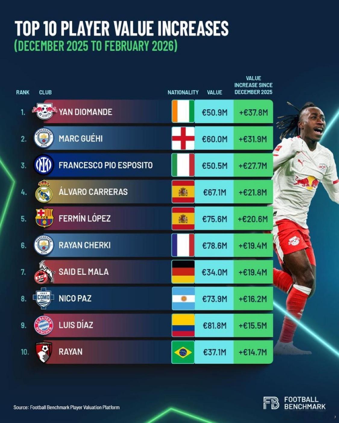Football benchmark列出了从25年12月到26年2月球员身价的涨幅榜博德闪耀3比1国际米兰冬奥会热点现场