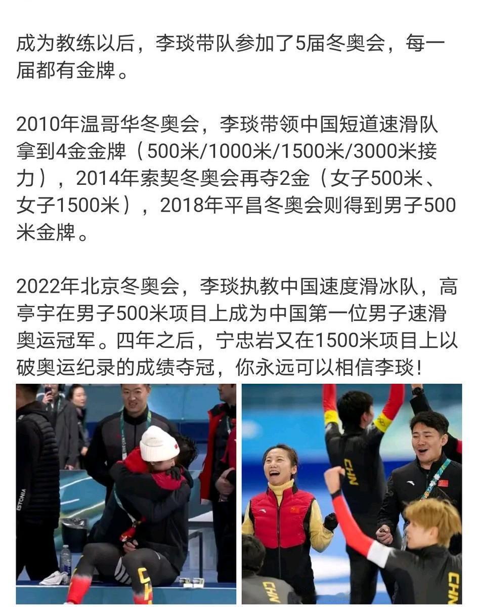 李琰NB!李琰带队参加了5届冬奥会,每一届都有金牌。今年带领宁忠岩夺得米兰冬奥会1500米速滑冠军。 冬奥会1500米速滑相当于夏奥会100米田径,宁忠岩打破奥运会纪录夺金,就是冰上博尔特,李琰就是紫薇星下凡。