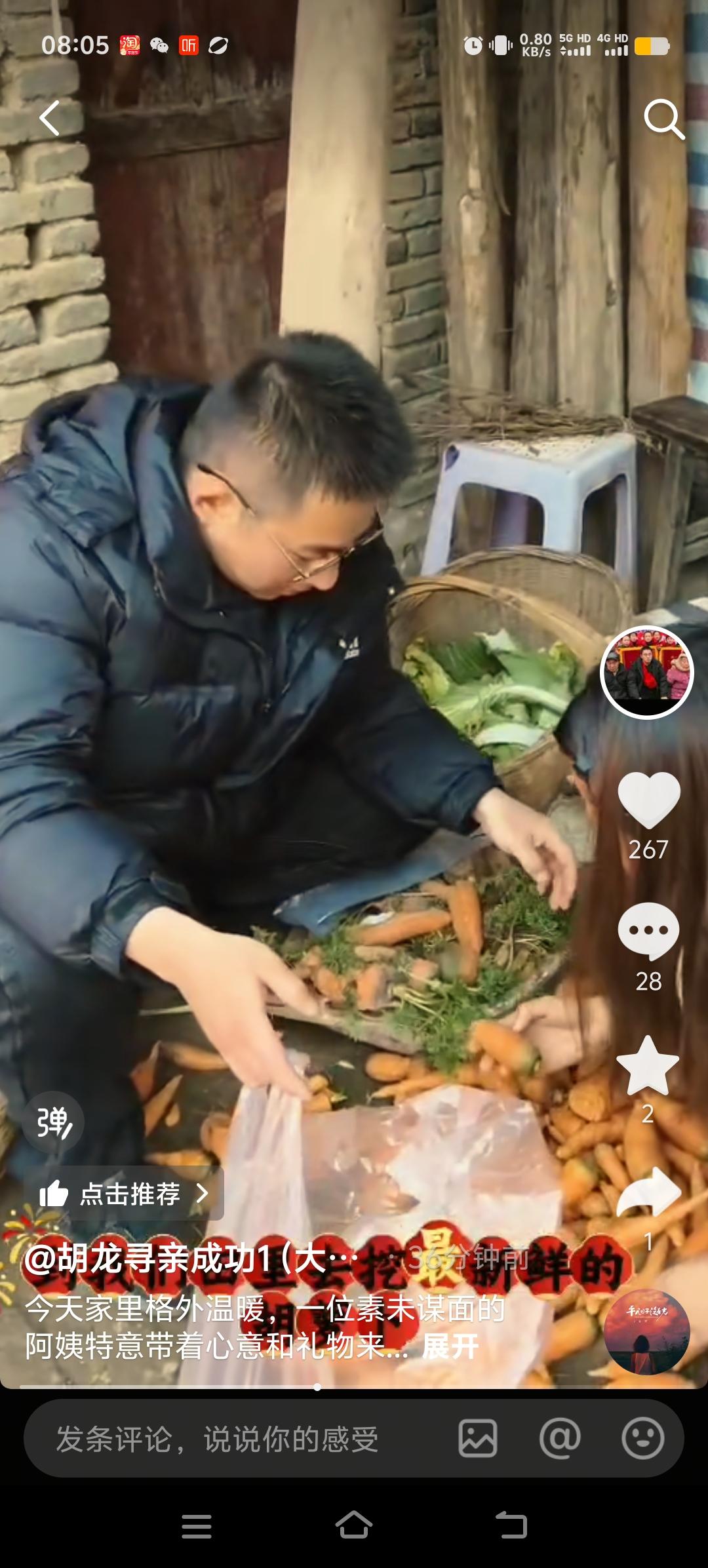 今天一大早,就有一位热心的阿姨开车前往胡龙的老家,看望胡龙的父母。这位热心的阿姨还给他们带了礼品。胡龙一家十分热情好客,给阿姨装了些胡萝卜,还去地里拔了些新鲜的胡萝卜让阿姨带上。 阿姨说,要是自己女儿没结婚,把女儿嫁给他就好了。胡龙听了这话,心里暖乎乎的。毕竟这么多年,他在婚恋市场上一直没遇到合适的对象,有人能看上他,就像在他的生活里点亮了一道光。 希望胡龙今年能早日找到属于自己的幸福,成家立业,过上美满的生活。