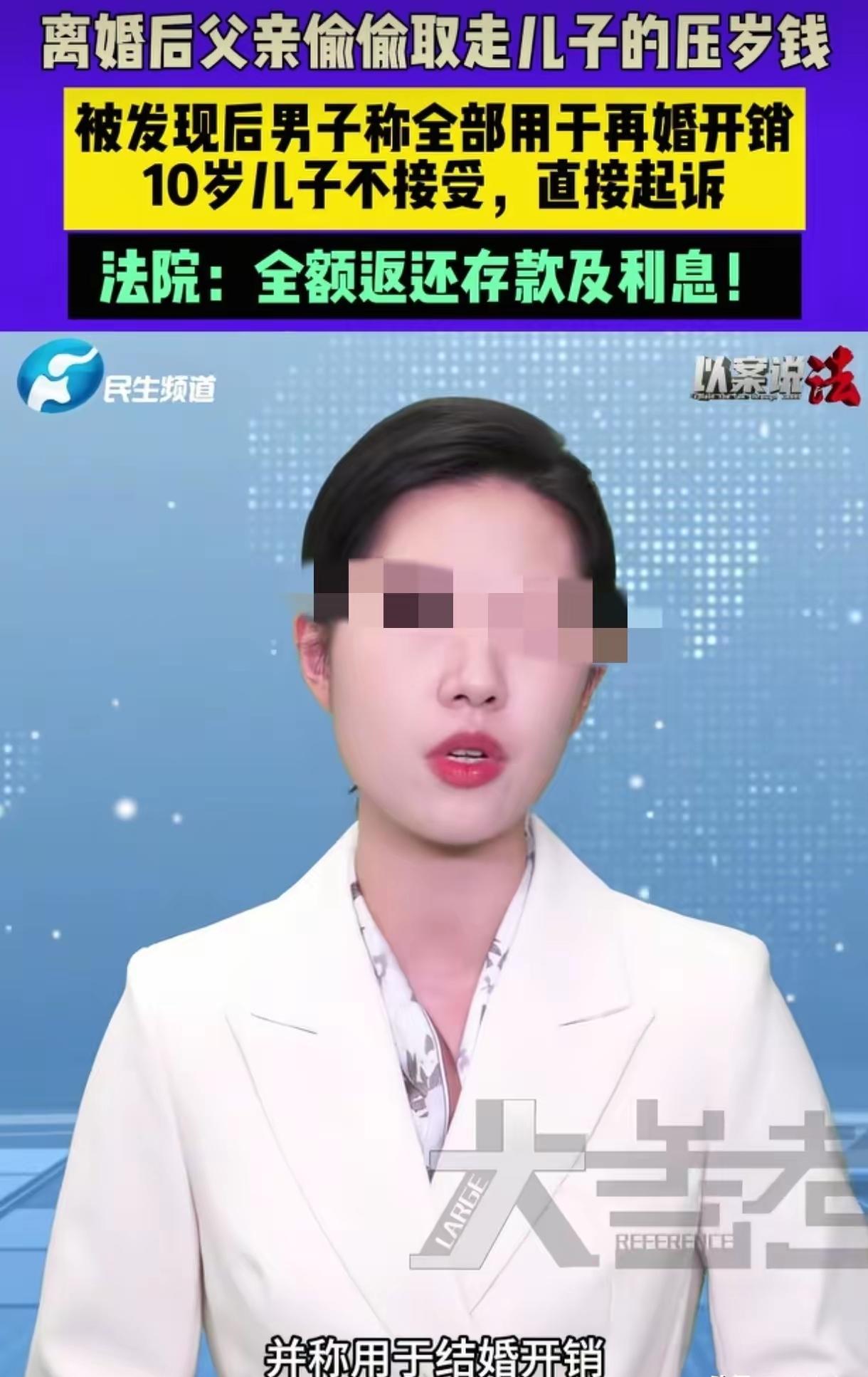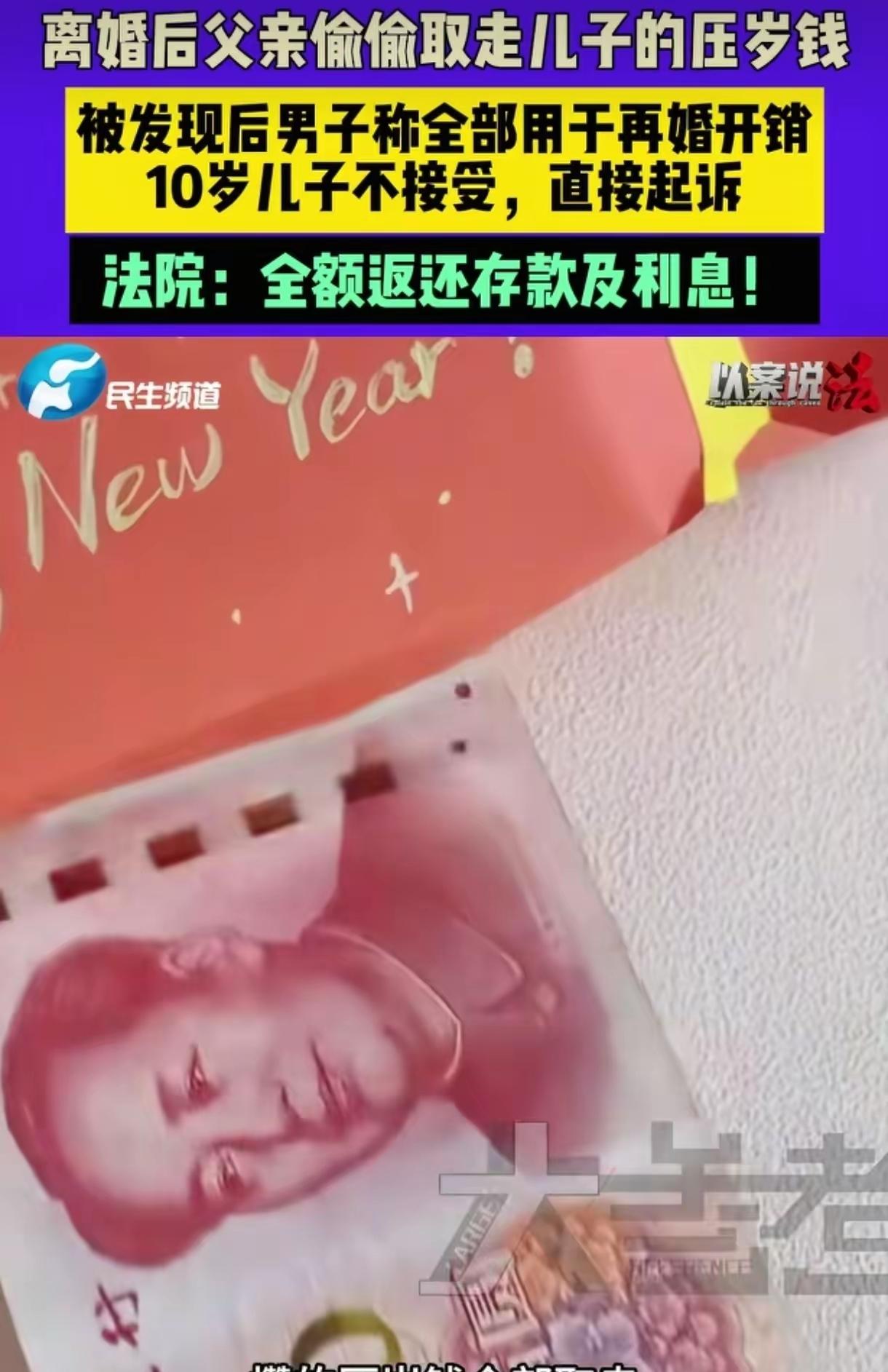河南郑州,男子和妻子离婚后,10岁的儿子跟着男子生活,男子再婚,并取走儿子8万多压岁钱用于婚后开销,随后男孩跟着母亲一起居住生活,发现父亲把自己的存款取走,要求父亲归还,未果后,男孩将父亲告上法庭,法院判决结果亮了。 不少人刷到这件事,第一反应是10岁孩子告父亲太过较真,甚至觉得伤了亲情。大家都没抓住问题的关键,这笔钱的归属从来没有争议,父亲的行为也早已超出合理监护的边界。 这8万多元是孩子十年间积攒的压岁钱,每一笔都来自长辈的自愿赠与,钱款交付完成后,所有权就完全属于孩子本人,和父母的婚姻状态、监护权归属没有任何关联。 父母离婚后孩子随父亲共同生活,父亲作为法定监护人,仅能对这笔财产履行保管义务,无权为自身利益擅自处置。 我国民法典第三十五条有清晰界定,监护人管理被监护人财产,必须以保障被监护人利益为唯一目的,不得将财产用于自身消费、家庭开支等与孩子无关的用途。 父亲将孩子的专属存款用于再婚日常开销,既未征得孩子同意,也完全违背监护职责的法定要求。 孩子变更抚养关系跟随母亲生活后,偶然发现存款被全部取走,他主动向父亲提出返还诉求,多次沟通都没有得到正面回应。 一个10岁的孩子愿意走进法庭提起诉讼,不是不懂亲情,是在被亲生父亲辜负后,找不到更温和的解决方式。 他清楚这笔钱是长辈为他留存的成长保障,不是父亲可以随意支配的家庭备用金。 生活中很多家长都陷入同样的认知误区,总觉得孩子的压岁钱属于家庭共有财产,自己作为监护人可以随意支配。 有人用孩子的压岁钱偿还债务、购置家用,甚至用于个人娱乐消费,还以“养育孩子多年”为借口自我辩解。 这种行为不仅触碰法律红线,更会摧毁孩子对家人的基本信任,扭曲孩子本该建立的财产观念与权利认知。 法院没有因血缘关系模糊责任边界,最终判决父亲全额返还8万多元本金及相应利息。这个判决看似冰冷,实则守住了未成年人权益保护的底线,也纠正了社会上普遍存在的错误观念。 监护权不等于支配权,亲情更不能凌驾于法律之上,未成年人的独立财产权利,不会因为年龄小就失去法律的保护。 父亲本应在婚姻破裂后,给孩子更多情感陪伴与生活保障,却用挪用压岁钱的方式,进一步伤害了孩子的情感。 孩子选择法律维权,不是对亲情的背叛,是对自身合法权利的清醒认知,也是对公平与规则的坚守。 家庭教育的核心从来不是物质供给,而是尊重与守护。尊重孩子的独立权利,不侵占孩子的个人财产,才能让孩子在成长中建立安全感与规则意识。 这件事也让所有家长反思,到底该如何平衡亲情与边界,又该如何履行合法合规的监护职责。 各位读者你们怎么看?欢迎在评论区讨论。