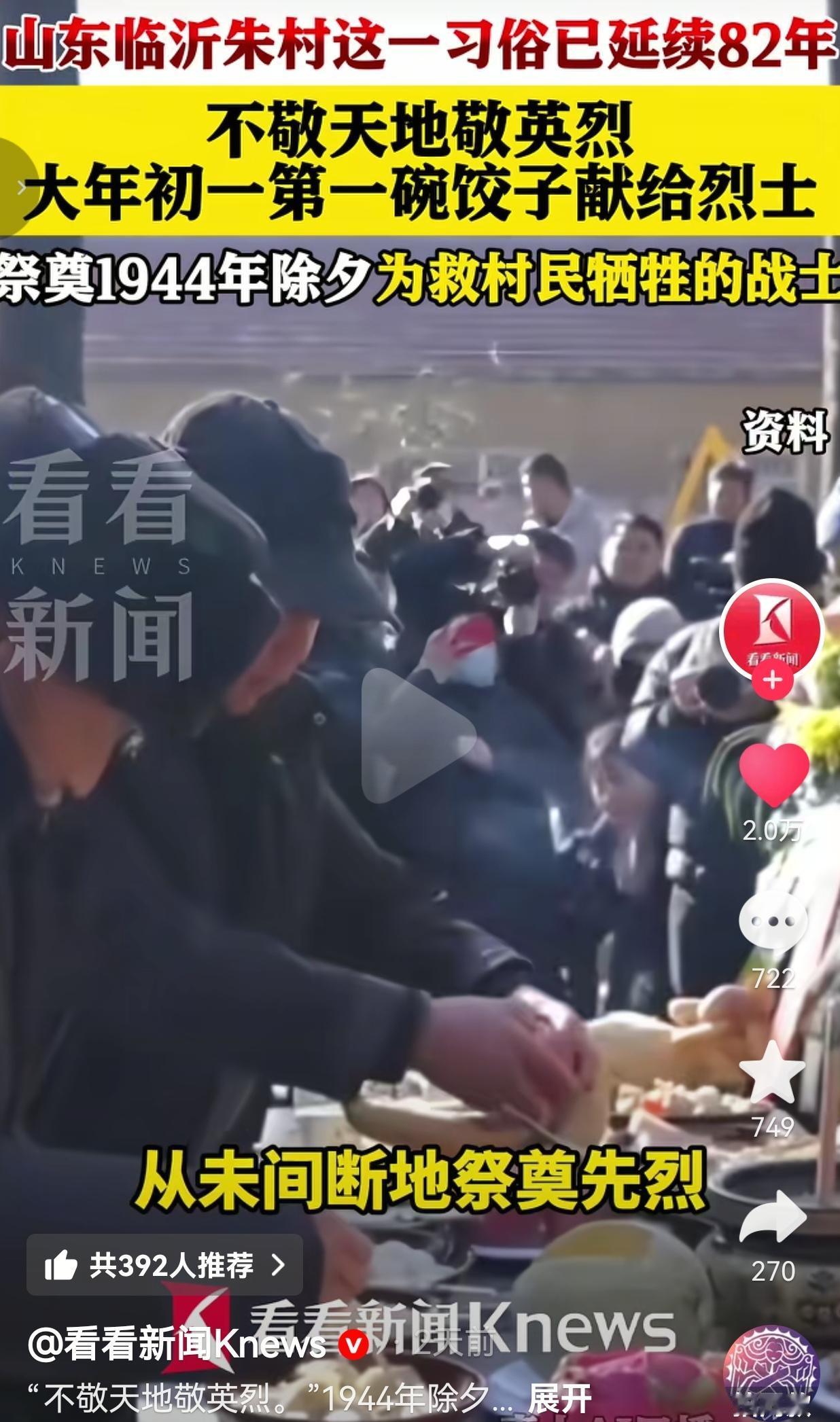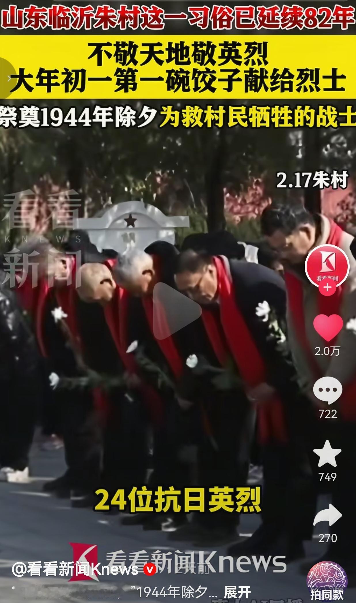 这才是我们应该祭拜的英雄!在山东临沂的朱村,有个规矩传了82年,这个习俗就是:大年初一的第一碗饺子,不拜天地,不拜鬼神,先端去敬给村里的24位抗日烈士。 这事要从1944年的除夕夜说起。那天,日军突然扫荡,24名年轻的八路军战士为了掩护村民转移,在与日寇的激战中壮烈牺牲,把生的希望留给了乡亲,自己却永远倒在了这片土地上。 那一夜,朱村的百姓逃过了劫难,却永远失去了这些最可爱的人。 那年的春节,村民们含泪送别子弟兵,从那以后,朱村人就立下了这个规矩:而后的每一个春节,他们都用这种方式,从未间断地祭奠先烈。 每年大年初一,天还没亮,全村人就会端着刚出锅的热饺子,来到烈士墓前。 热气腾腾的饺子摆上,再点上一炷香,说一句“娃们,过年了,吃饺子了”。 这一碗热气腾腾的饺子,是跨越82年的承诺,也是一份沉甸甸的家国记忆。这一敬,就是82年,从白发老人到懵懂孩童,没人敢忘。 我刷到这个视频的时候,鼻子一下就酸了。我们总说“岁月静好”,可哪有什么静好,不过是有人替我们负重前行。 这些战士牺牲的时候,大多才二十出头,他们也有父母,也盼着过年吃顿饺子,可他们把生的机会给了素不相识的百姓。 朱村人用一碗饺子,把这份恩情刻进了骨子里。这不是什么惊天动地的大事,却比任何豪言壮语都动人。 它告诉我们:英雄从不是课本里的名字,而是活在我们每一个寻常日子里的牵挂;感恩也不是一句口号,而是代代相传的行动。 现在的我们,过着安稳的日子,过年能吃着热气腾腾的饺子,可别忘了,这安稳是无数英雄用命换来的。 我们总说要传承红色基因,可传承到底是什么?在我看来,就是像朱村人这样,把英雄的名字记在心里,把感恩的行动做在实处,让英雄的精神在烟火气里代代相传。 针对此事,你有什么看法呢?欢迎评论区唠唠。