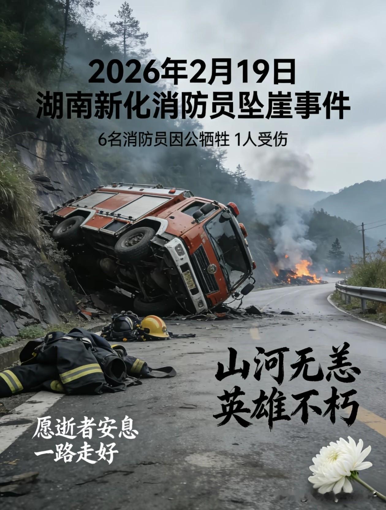 他们灭完了火,却没能回家! 大年初三,湖南7名消防员执行完灭火任务后,返程途中不幸坠崖,导致6死1伤! 烟花爆竹死亡12个,我感觉特别的惋惜,生命是如此脆弱,但听见消防员牺牲了,还一下就是6个,感觉心如刀绞,无法接受这么残忍的意外。 建议以后救援出任务,应该专门有人负责开车,司机就不去参与救援,救火后已经很疲惫了,要救援又要开车,真的有点不安全。 既然无人机都这么发达了,灭火这么危险的工作,就应该让无人机和机器人去完成,大家觉得呢? 致敬年轻的英雄[玫瑰][玫瑰][玫瑰]!