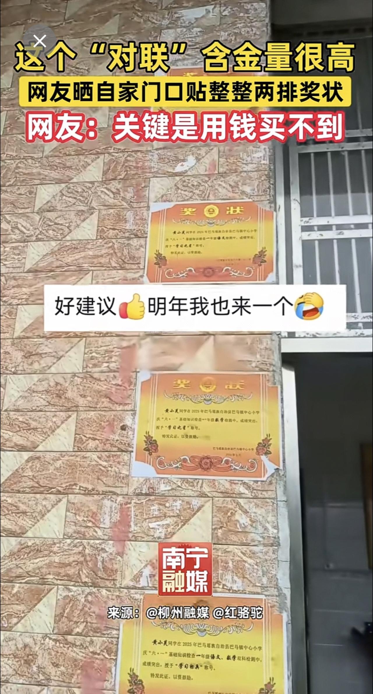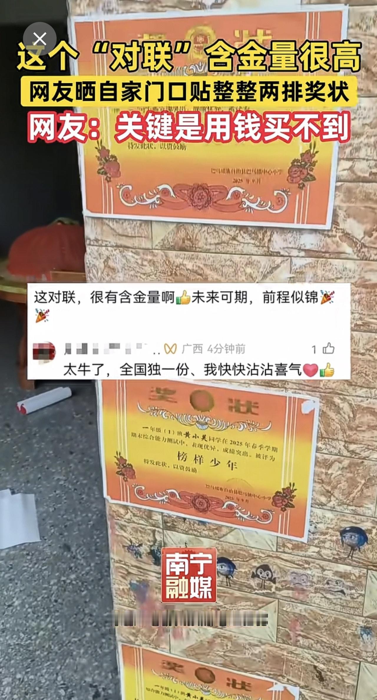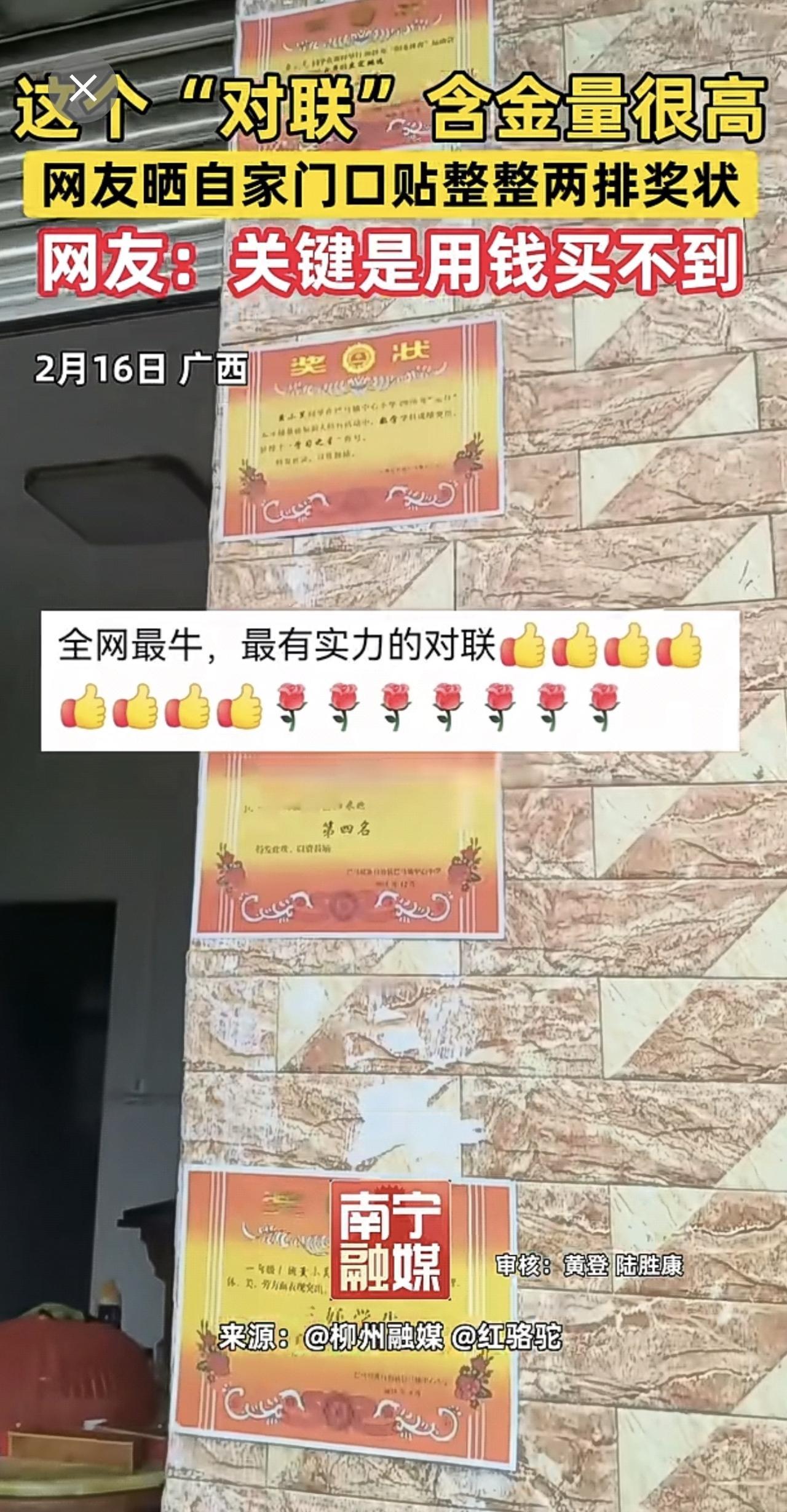 广西网友晒独特“奖状对联”,家门口两排奖状超有含金量,网友:用钱都买不到 (剪辑:李璐)春节 对联