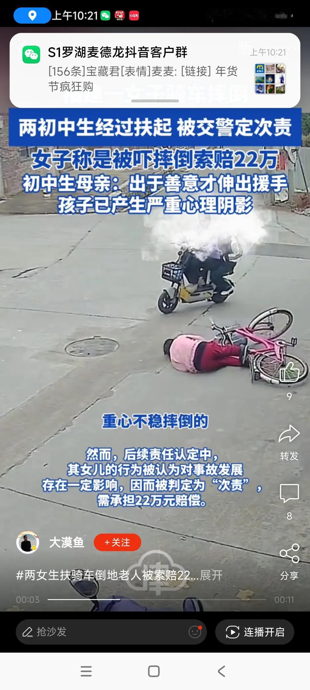 感觉这个老人能单独骑自行车上街,岁数不是太大,另外自行车速度又不快,摔跤了也不会太严重,怎么会造成严重后果,,,[捂脸][捂脸][捂脸] 当时两个女生骑一个电动车,在交通路口,拐弯,速度不快,并没有碰倒老人,这个老人看见电动车过来,心慌意乱,自己摔了一跤,,怎么要女生赔偿22万元,这两个女生为啥要承担这么大的责任啊,没搞明白,, 想想二十年前,我在一家电器公司上班,客户买了一台电视机,是显像管电视,很重,大概有八十多斤,我和同事小心翼翼从纸箱抬出来,放在电视柜上面,不小心在电视柜上面划了一个几厘米的印子,影响并不大,这个客户脸色大变,要我们赔他300元,当时我工资一个月才一千多元,吓我一跳,没想到这么严重后果,我和同事当时没那么多现金,他记下我们名字,第二天,客户的妈妈,一个七十多岁老太太,到我们公司了,[捂脸][捂脸]吓我一跳,,,赶紧赔了他300元,,老太太才离开公司,,, 这个客户,是我工作以后,遇到的最难缠的人,这样的人,不是善良的人,心胸狭隘,最好远离这种人,,,