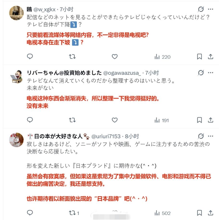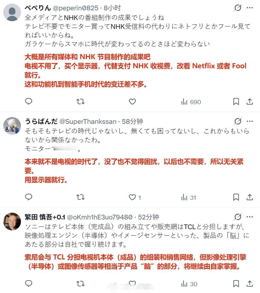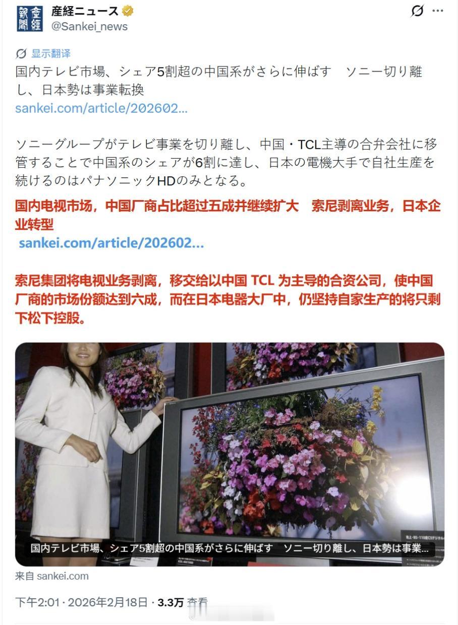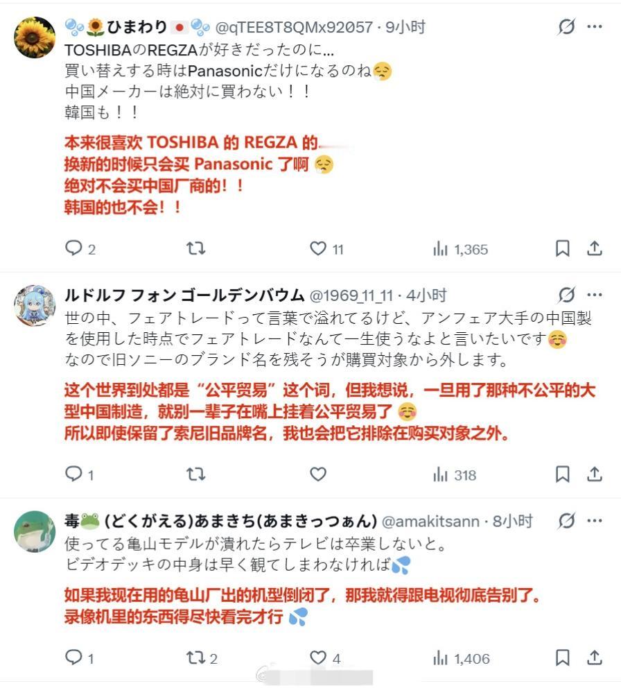日本媒体报道称,由于索尼等厂商退出电视机制造市场,目前中国厂商在日本市场的占比超过5成乃至6成,而且还在持续扩大,目前日本国内自产电视机的大厂只剩下松下。 评论区的日本网民在叫嚣“绝不买中国货,韩国的也不买”,“反正以后也不看电视了,买显示器就行”。 但也有不少人认为“日本家电已经走向终结了”。索尼工厂撤闭 索尼日本 索尼牌电视机