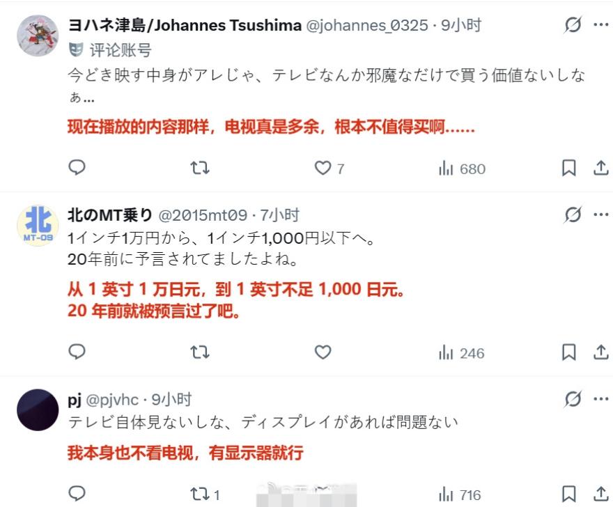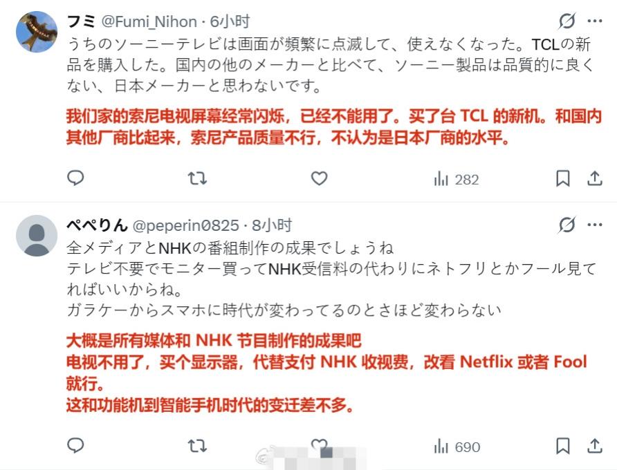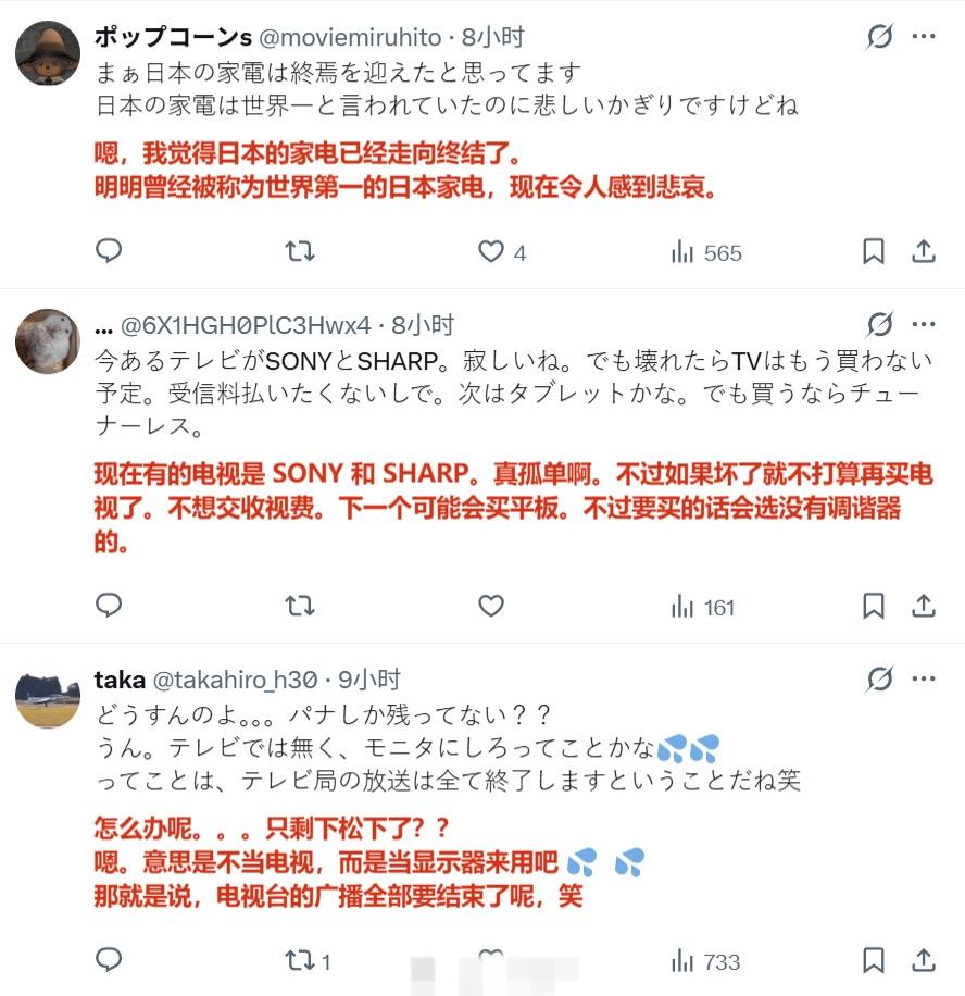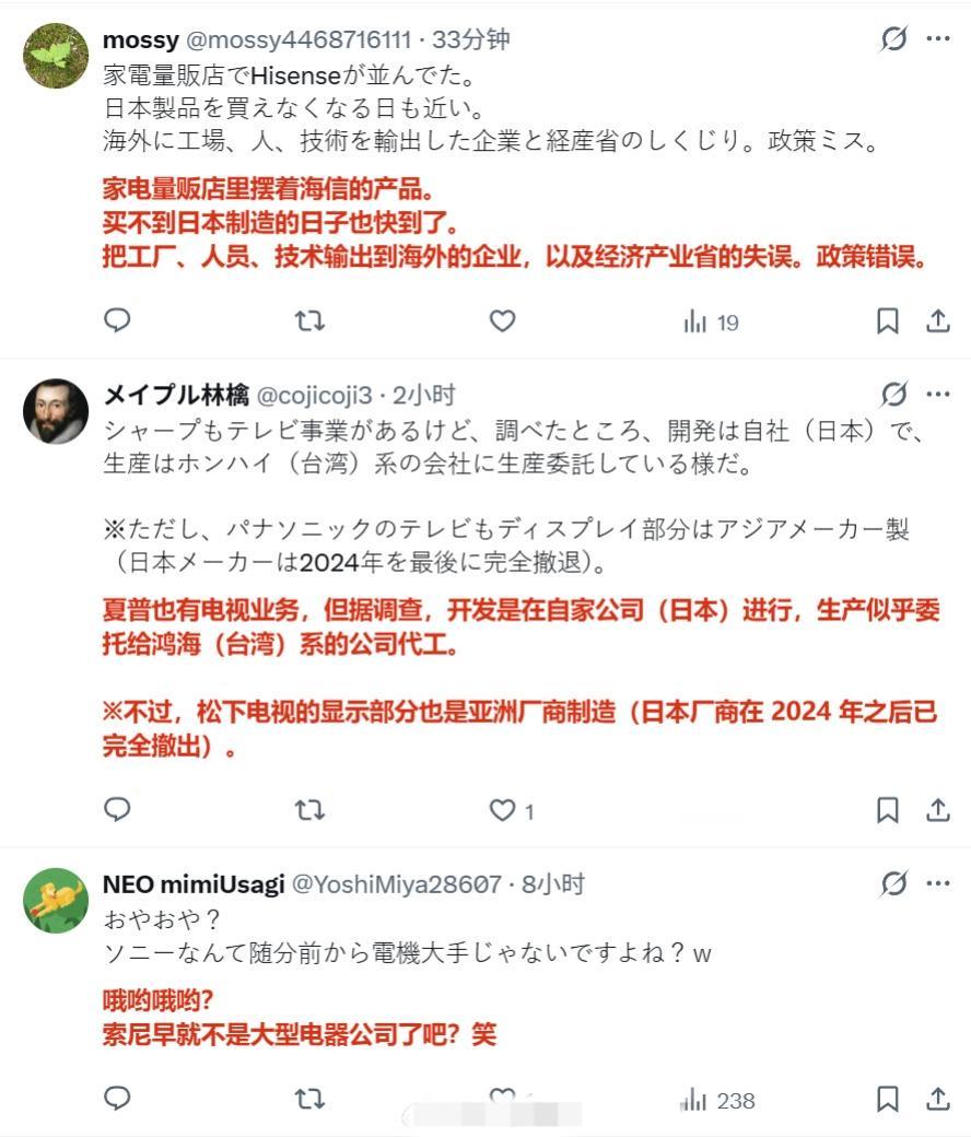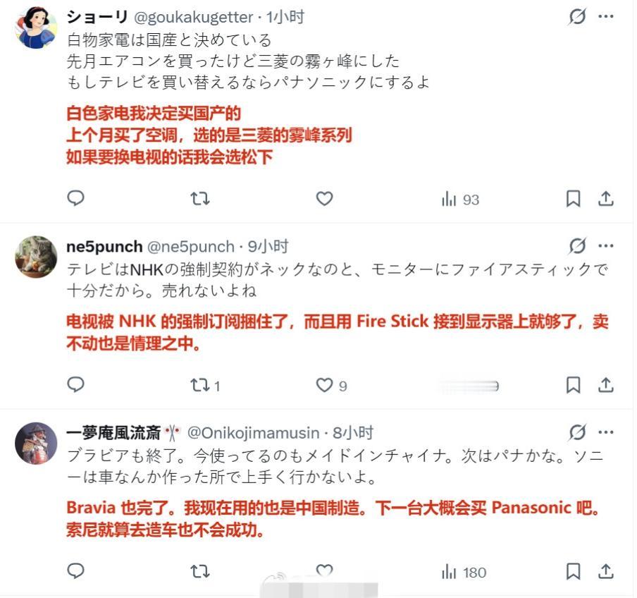 日本媒体报道称,由于索尼等厂商退出电视机制造市场,目前中国厂商在日本市场的占比超过5成乃至6成,而且还在持续扩大,目前日本国内自产电视机的大厂只剩下松下。 评论区的日本网民在叫嚣“绝不买中国货,韩国的也不买”,“反正以后也不看电视了,买显示器就行”。 但也有不少人认为“日本家电已经走向终结了”。索尼工厂撤闭 索尼日本 索尼牌电视机